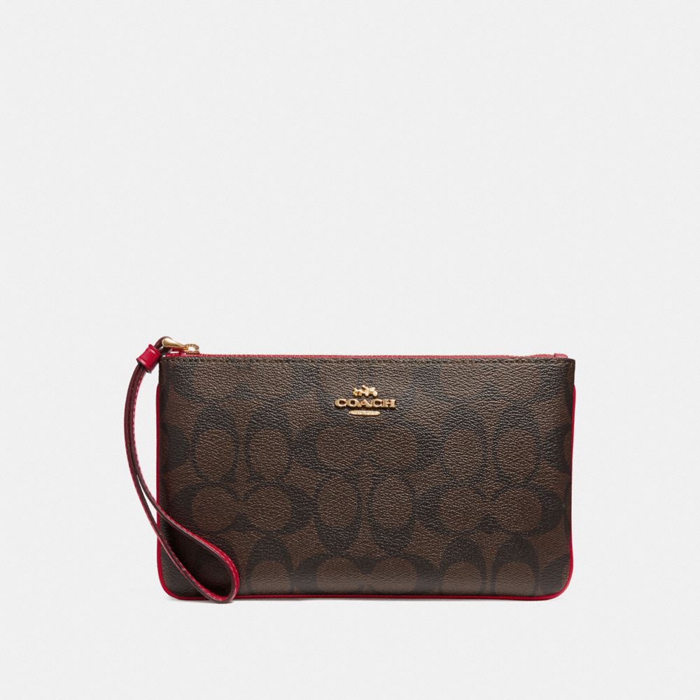 | Signature coated canvas| Six credit card slots| Inside multifunction pocket| Zip-top closure, fabric lining| Wrist strap attached| 8" (L) x 4 3/4" (H) x 3/4" (W)