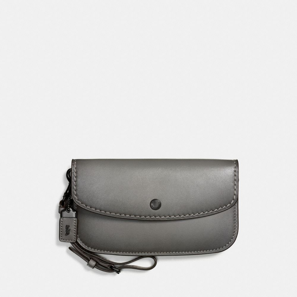 Glovetanned leather| Two credit card slots| Inside zip and open pockets| Snap closure| Outside slip pocket| Detachable wrist strap| 7 1/4" (L) x 4 1/4" (H) | Fits all phone sizes up to an iPhone X