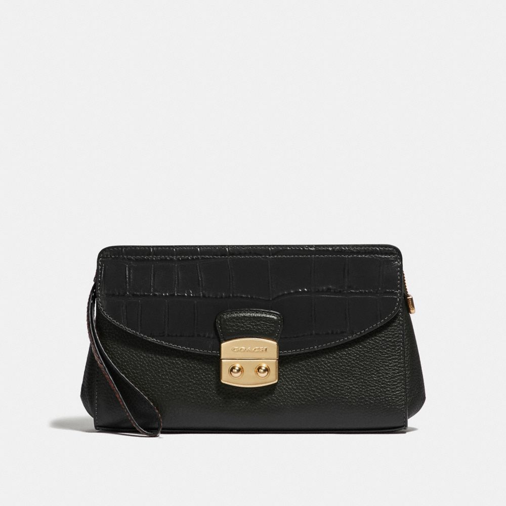 | Crocodile-embossed leather, snake-embossed leather and refined pebble leather| Inside multifunction pocket| Zip closure, fabric lining| Attached wrist strap| Front flap pocket| 9" (L) x 5 1/4" (H) x 2 1/4" (W)