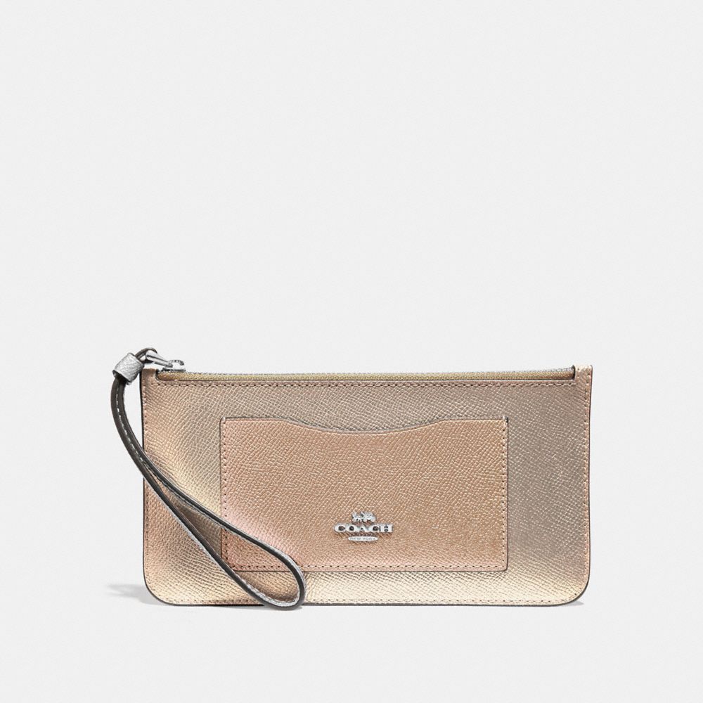 | Metallic crossgrain leather| Inside open compartment| Zip-top closure| Seven credit card slots| Full-length bill compartment| Attached wrist strap| 7 3/4" (L) x 4 1/4" (H) x 3/4" (W)
