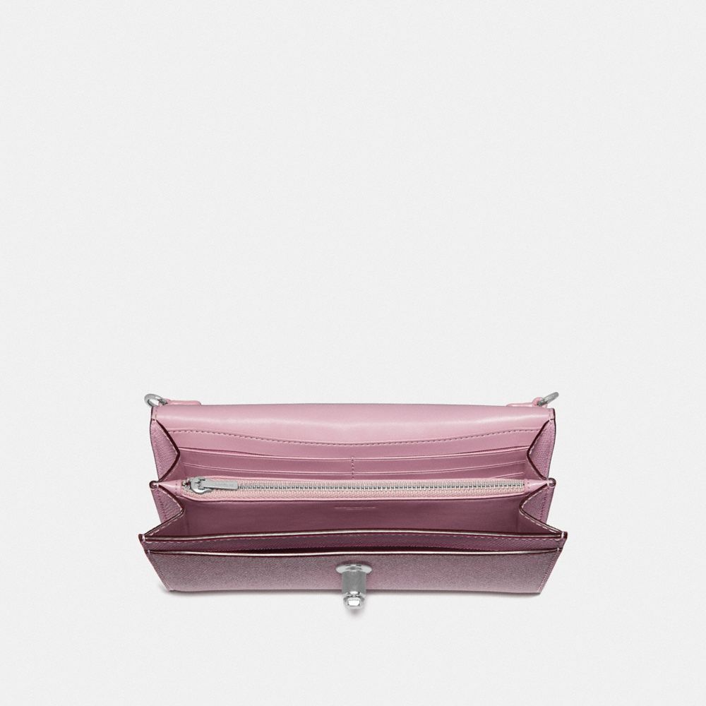 Crossgrain leather| Ten credit card slots| Full-length bill compartment| Inside zip compartment| Turnlock closure, fabric lining| Detachable wrist strap| Outside slip pocket| Detachable long strap with 23" drop for shoulder or crossbody wear| 8" (L) x 5" (H) x 3/4" (W)