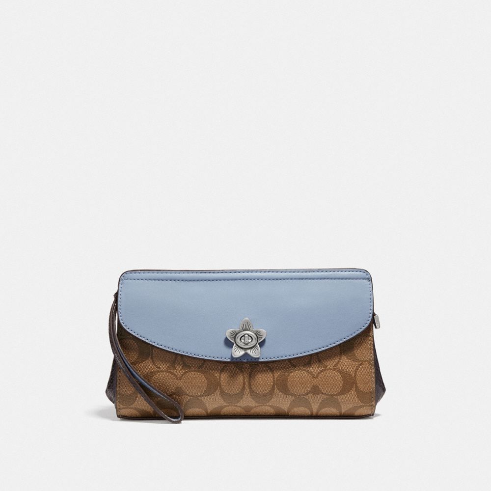 Signature coated canvas, smooth leather, snake-embossed leather| Inside multifunction pocket| Zip closure, fabric lining| Wrist strap attached| Front flap pocket| 9" (L) x 5 1/4" (H) x 2 1/4" (W)