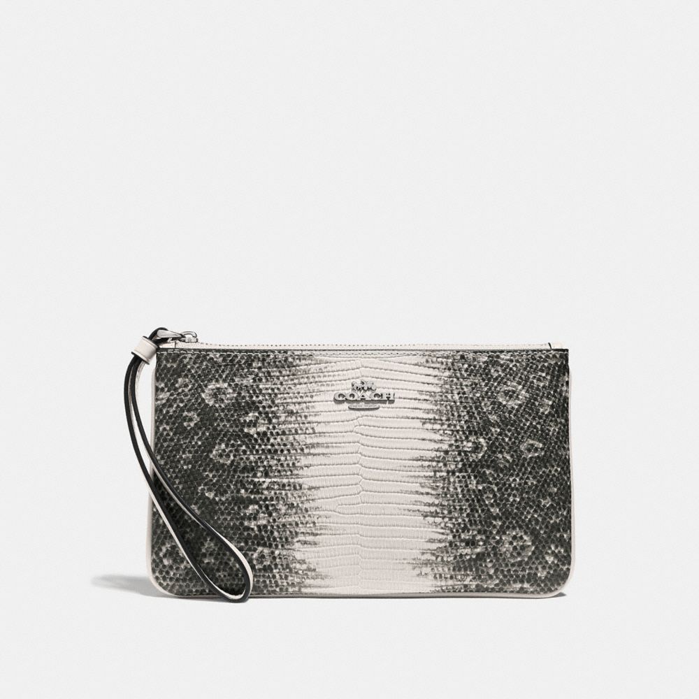 Lizard-embossed leather| Six credit card slots| Inside multifunction pocket| Zip-top closure, fabric lining| Wrist strap attached| 8" (L) x 4 3/4" (H) x 3/4" (W)