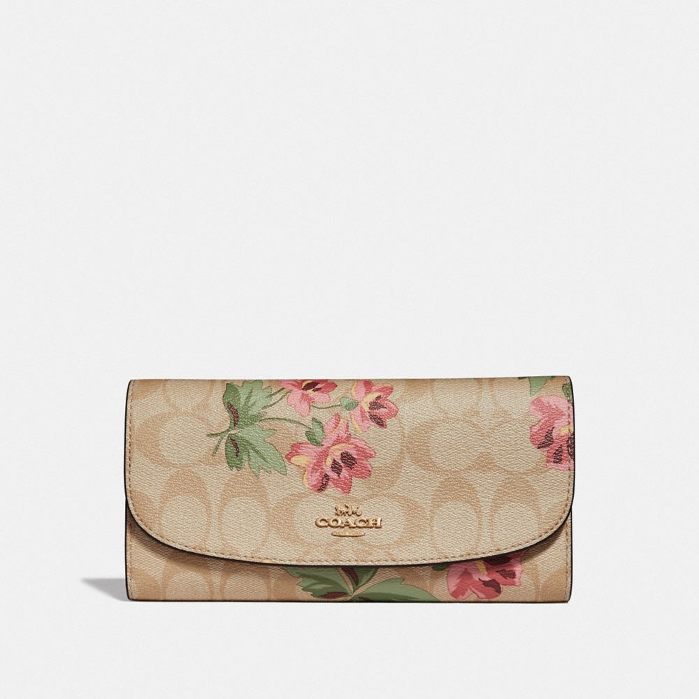 Signature coated canvas| 12 credit card slots| Full-length bill compartment| Removable checkbook holder| Snap closure| Outside zip coin pocket| 7 3/4" (L) x 4" (H)