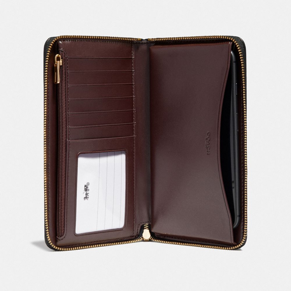 Printed coated canvas with smooth leather details| Six credit card slots| ID window| Zip coin pocket| Inside phone pocket| Zip-around closure| Wrist strap attached| 7 1/4" (L) x 4" (H) x 3/4" (W)