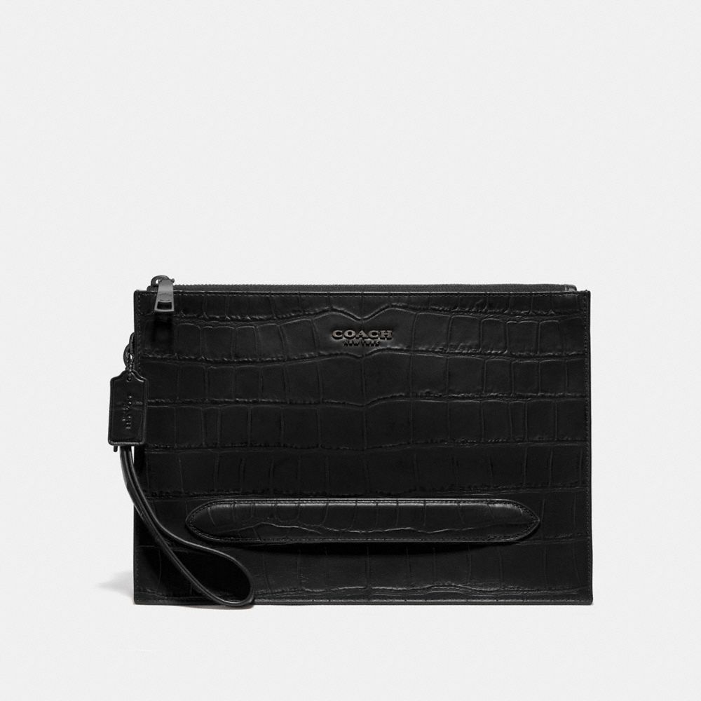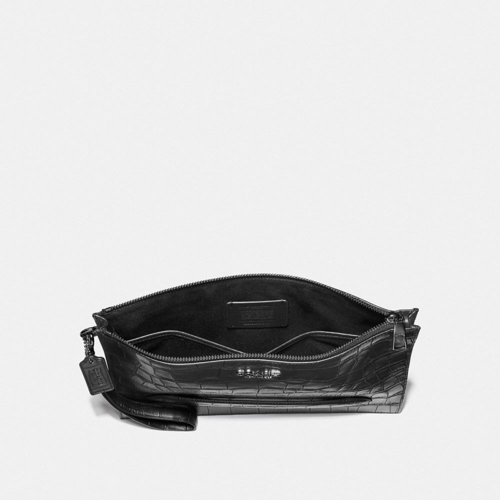 Crocodile-embossed leather with refined calf leather details| Inside multifunction pocket| Zip-top closure, fabric lining| Outside zip pocket| Slip handle for clutch function| Detachable wrist strap| 11 3/4" (L) x 8" (H) x 2" (W)