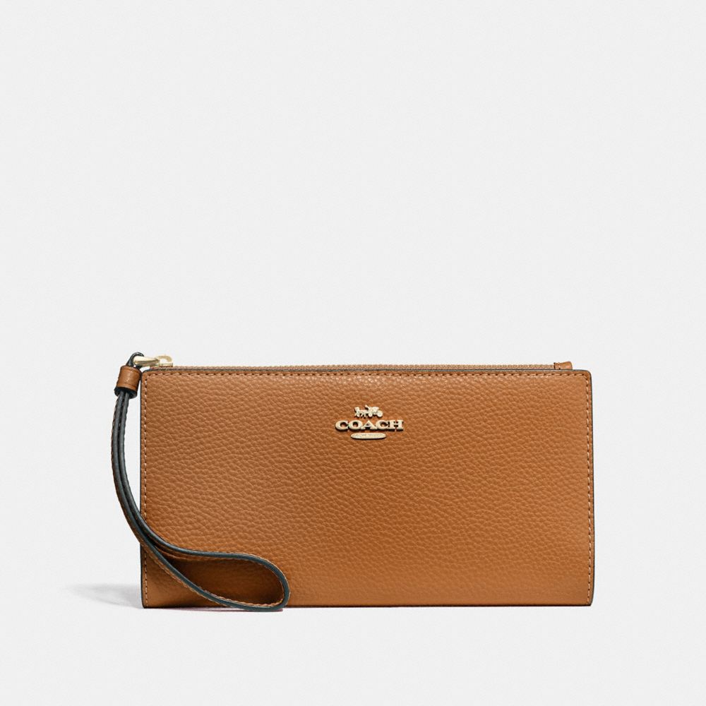 Polished pebble leather| Six credit card slots| ID window| Full-length bill compartments| Zip coin pocket| Snap closure| Wrist strap attached| 7 1/2" (L) x 4" (H) x 3/4" (W)