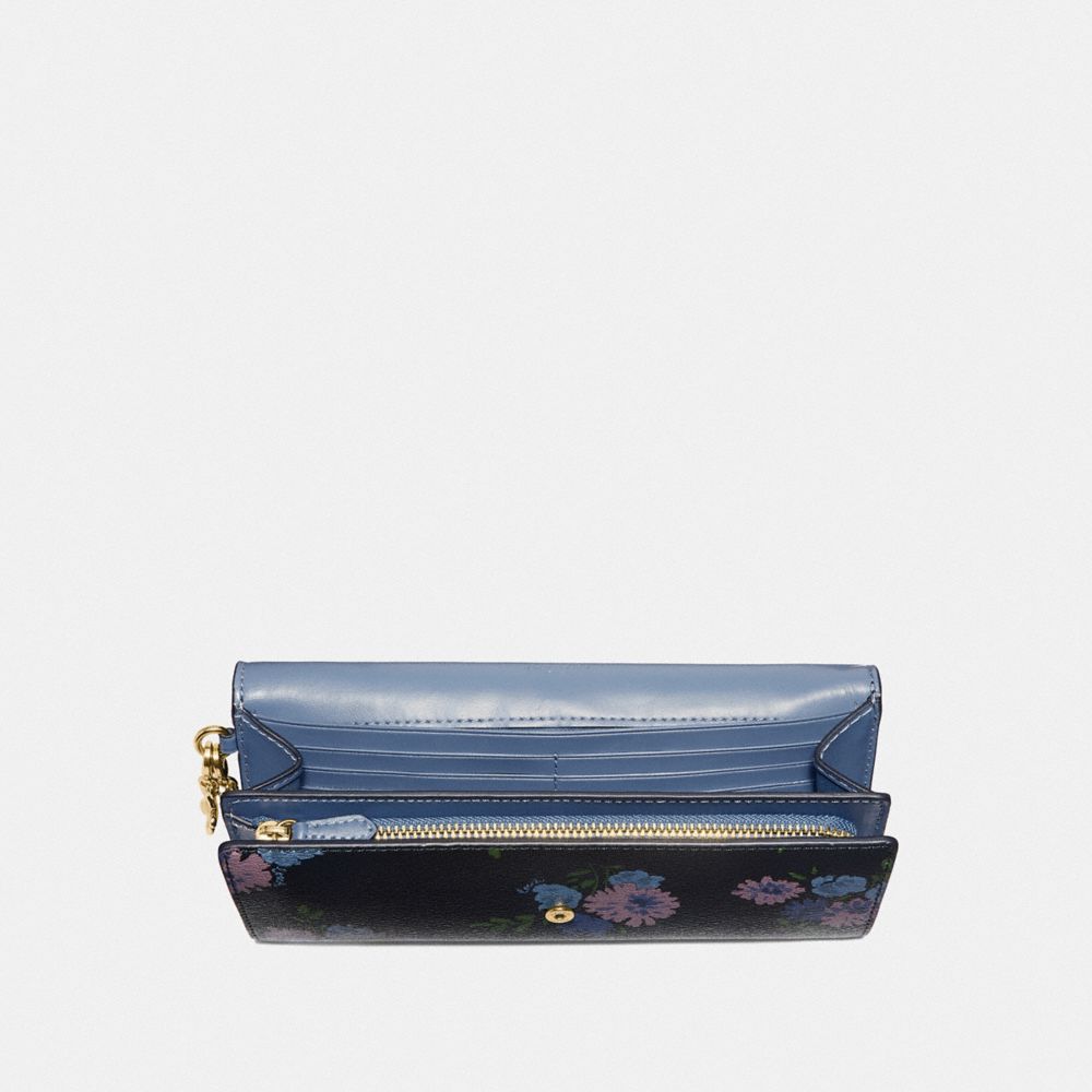 Printed coated canvas with smooth leather details| 12 credit card slots| Full-length bill compartment| Zip coin pocket| Snap closure| Outside open pocket| 7 3/4" (L) x 4" (H) x 3/4" (W)| Packaged in a Coach gift box