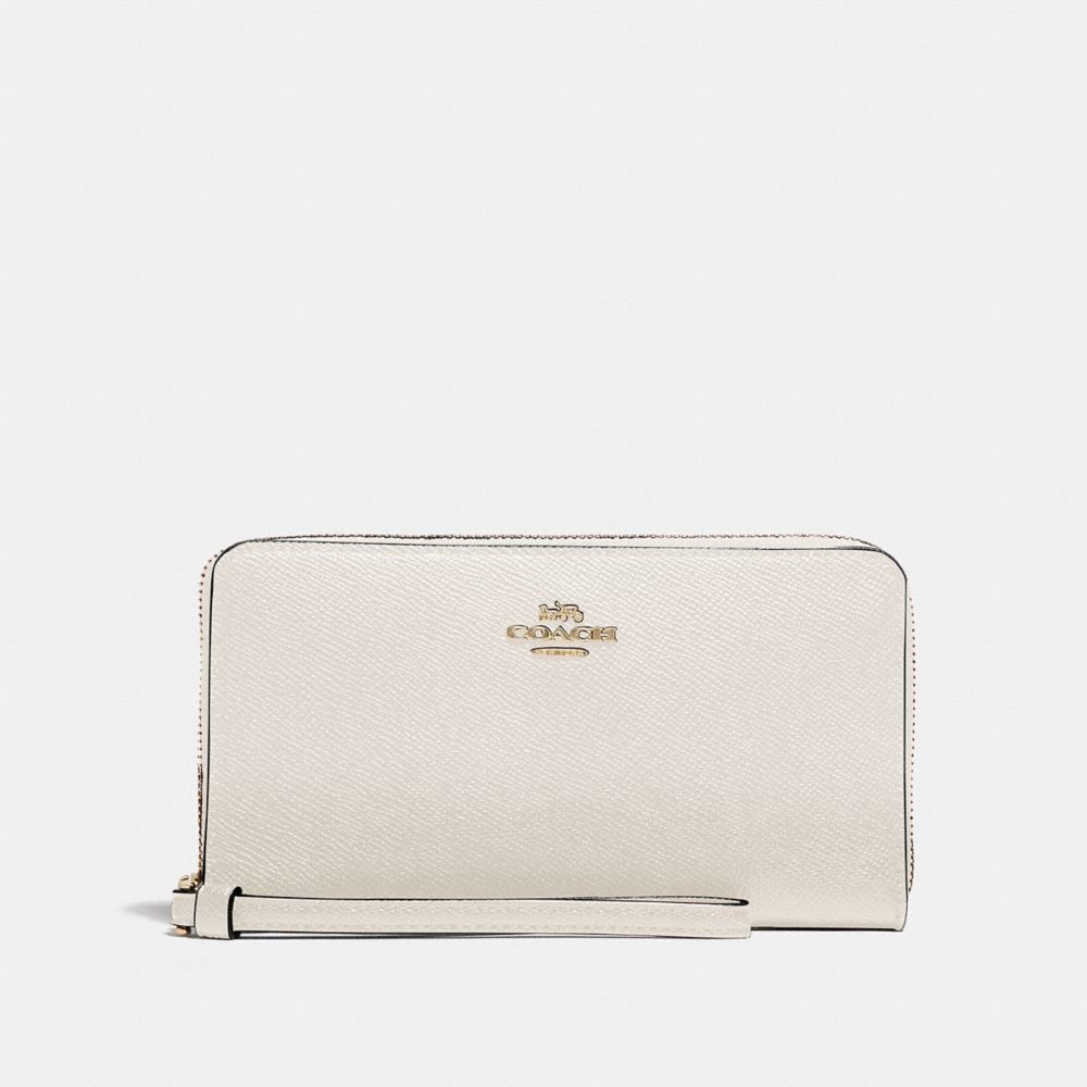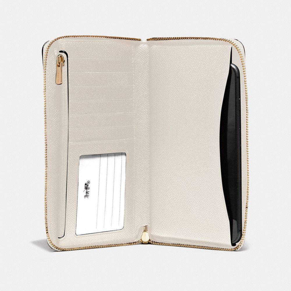 Crossgrain leather| Six credit card slots| ID window| Zip coin pocket| Inside phone pocket| Zip-around closure| Wrist strap attached| 7 1/4" (L) x 4" (H) x 3/4" (W)