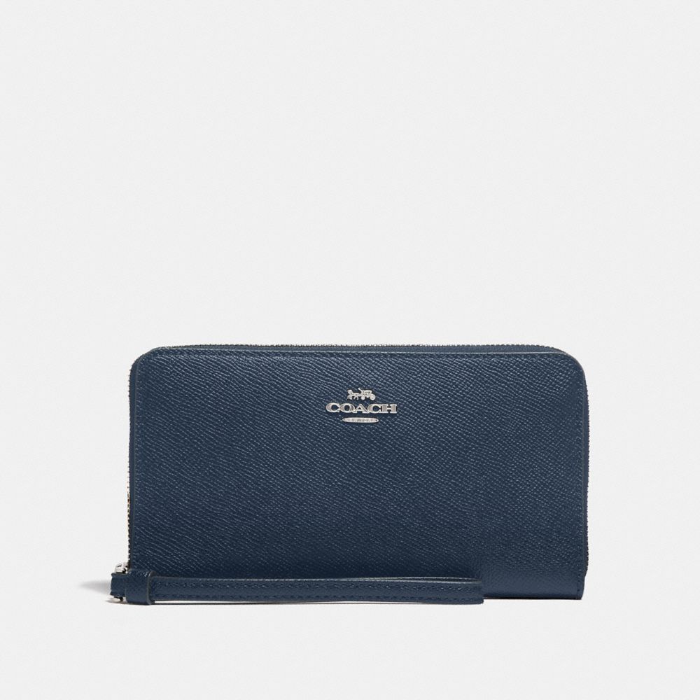 Crossgrain leather| Six credit card slots| ID window| Zip coin pocket| Inside phone pocket| Zip-around closure| Wrist strap attached| 7 1/4" (L) x 4" (H) x 3/4" (W)