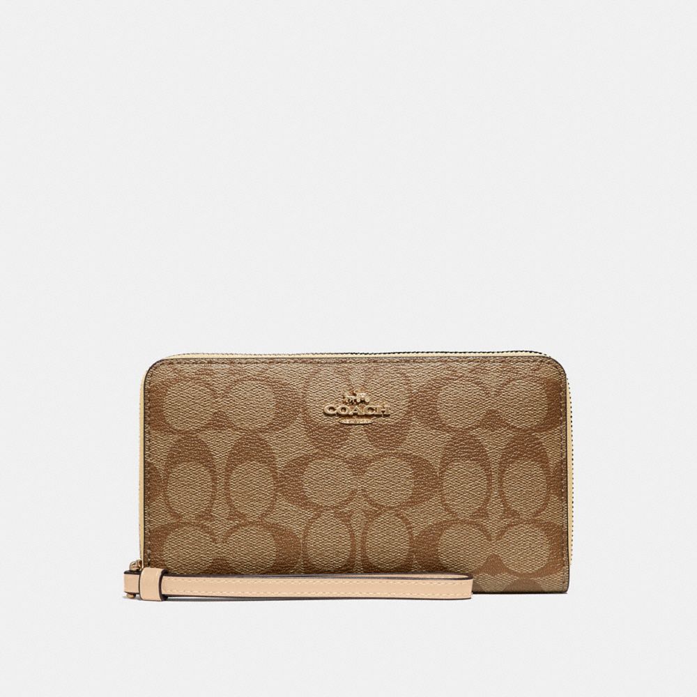 Signature coated canvas with smooth leather details| Six credit card slots| ID window| Zip coin pocket| Inside phone pocket| Zip-around closure| Wrist strap attached| 7 1/4" (L) x 4" (H) x 3/4" (W)