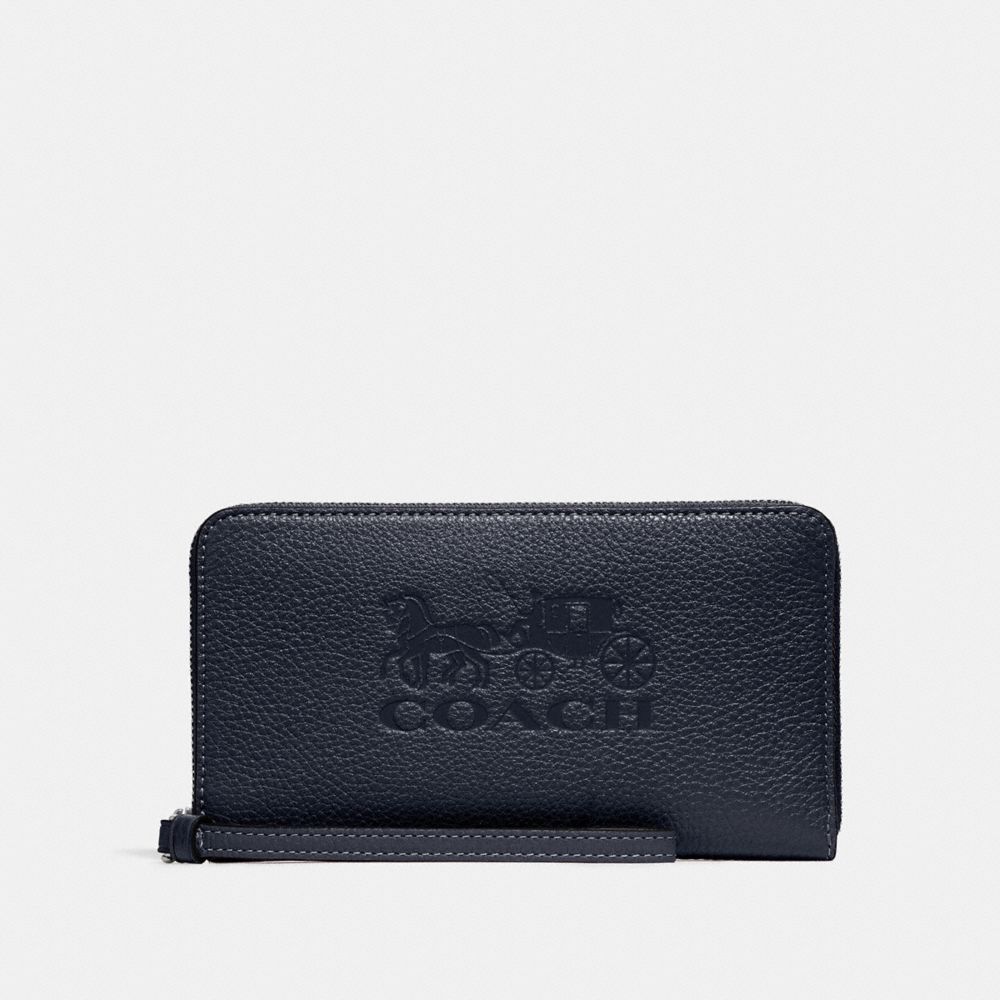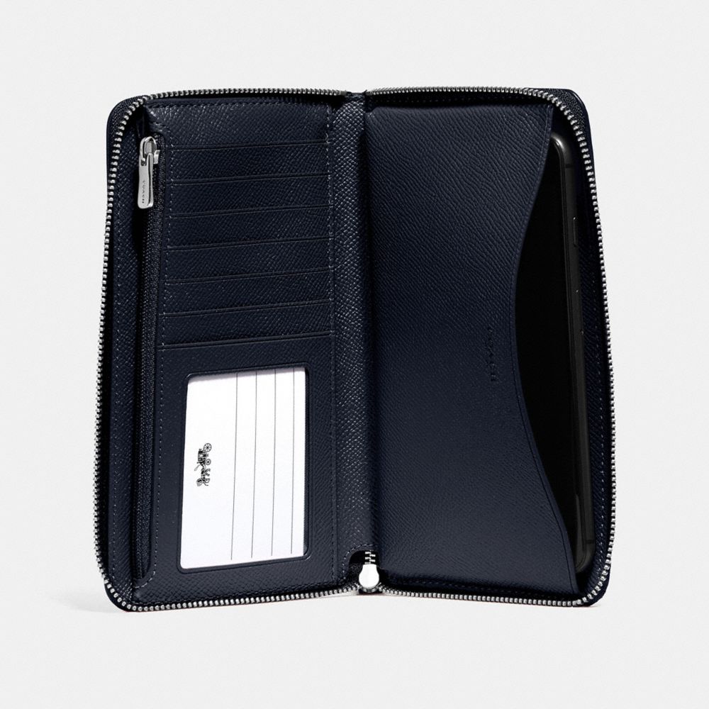 Refined pebble leather| Six credit card slots| ID window| Zip coin pocket| Inside phone pocket| Zip-around closure| Wrist strap attached| 7 1/4" (L) x 4" (H) x 3/4" (W)