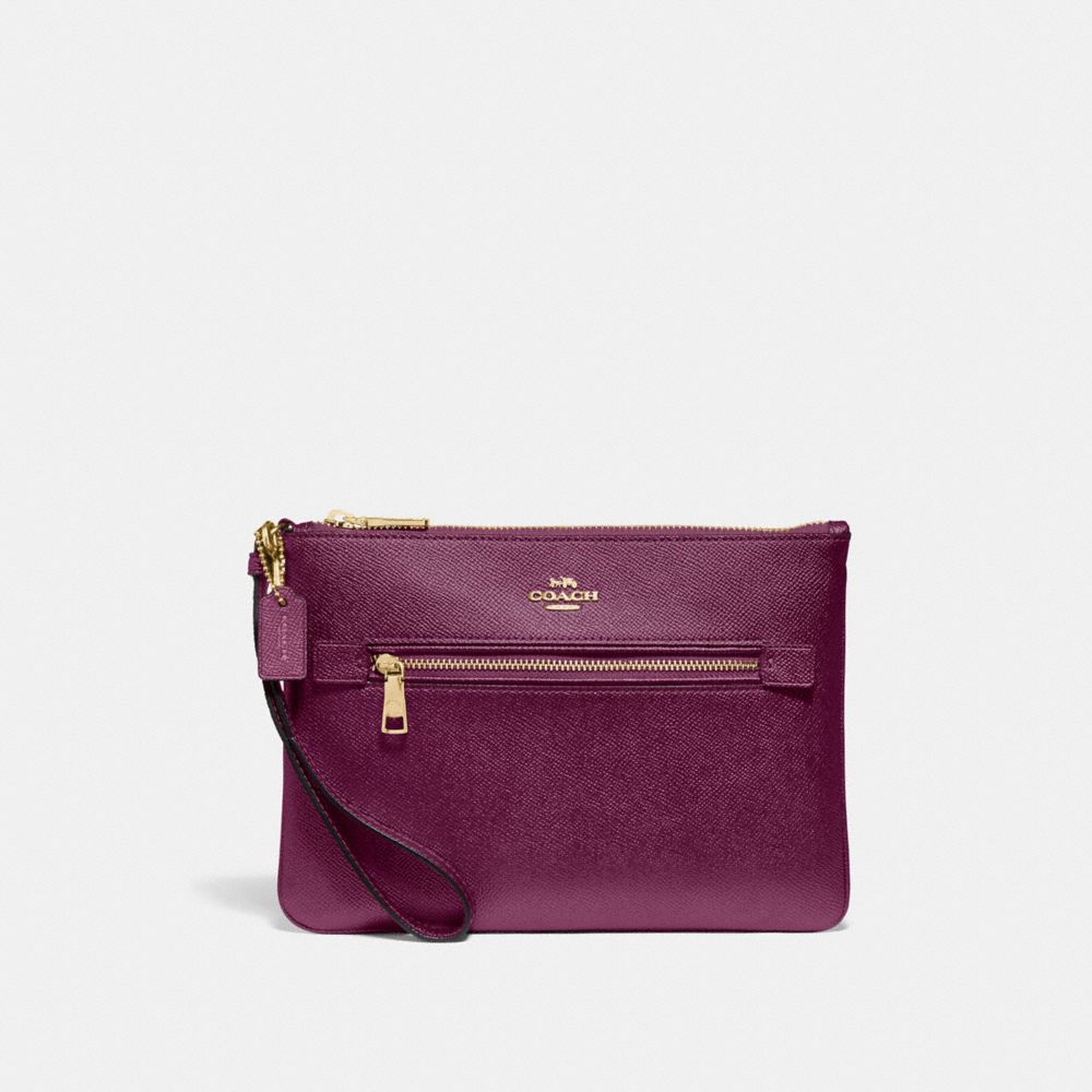 Crossgrain leather| Two credit card slots| Zip-top closure, fabric lining| Outside zip pocket| Detachable wrist strap| 9 1/4" (L) x 6 3/4" (H)