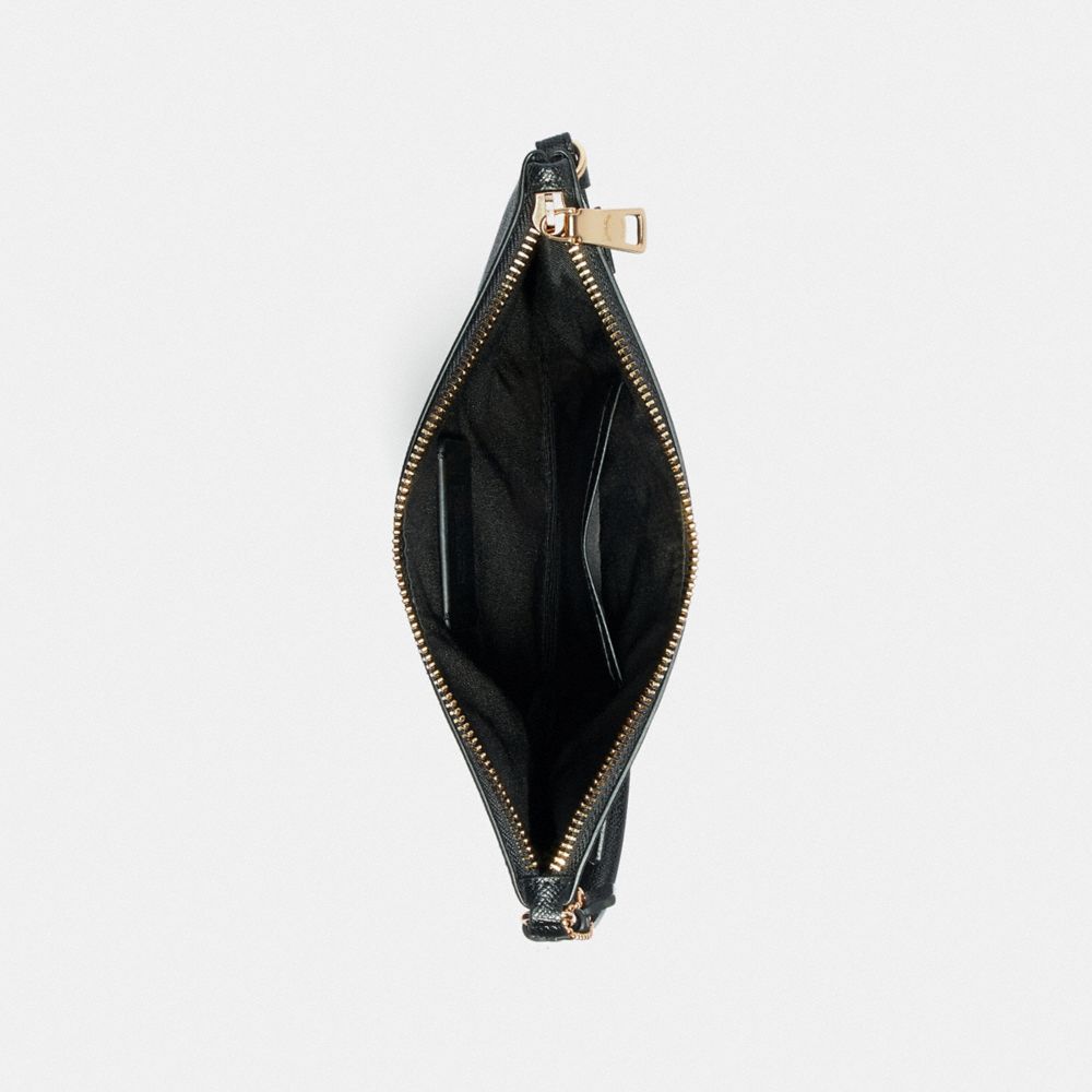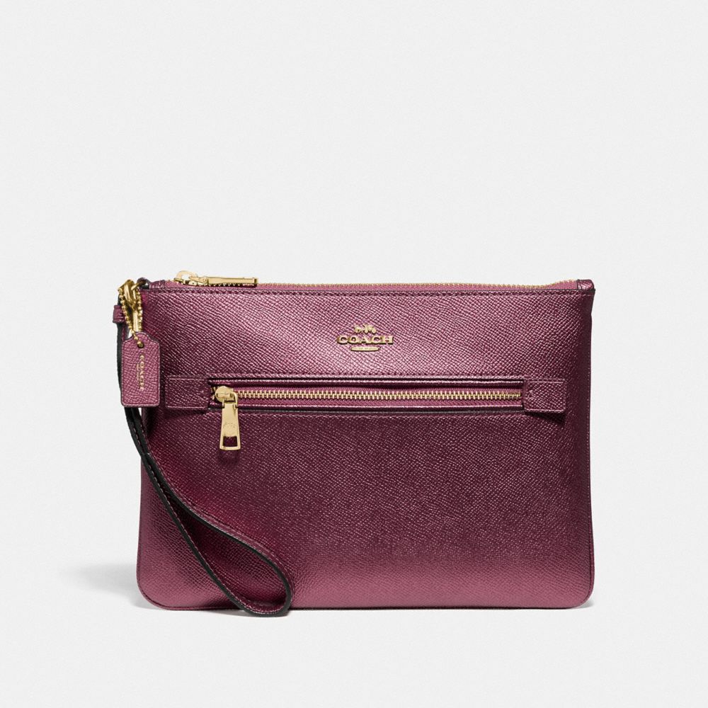 Crossgrain leather| Two credit card slots| Zip-top closure, fabric lining| Outside zip pocket| Detachable wrist strap| 9 1/4" (L) x 6 3/4" (H)