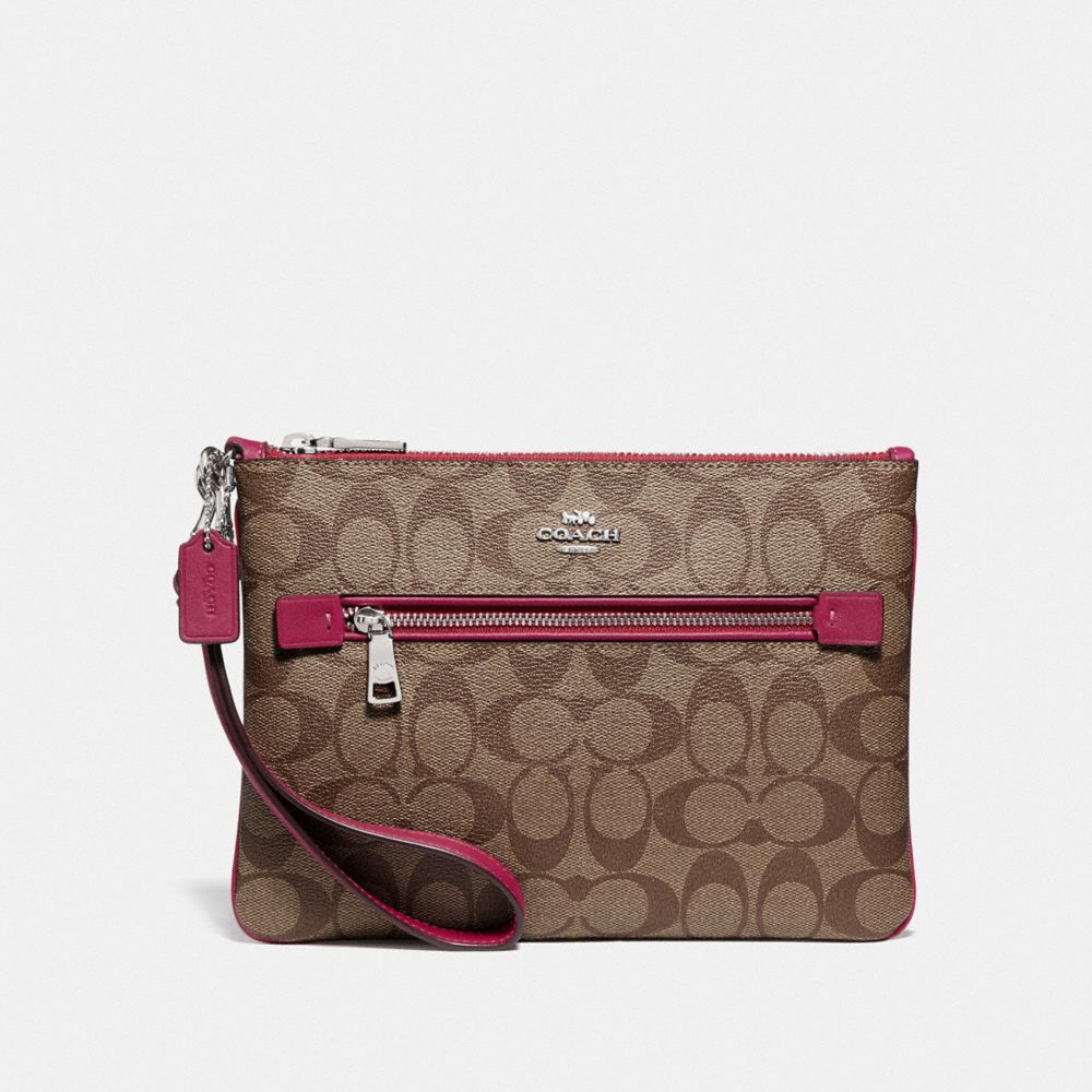 Signature coated canvas with smooth leather details| Two credit card slots| Zip-top closure, fabric lining| Outside zip pocket| Detachable wrist strap| 9 1/4" (L) x 6 3/4" (H)