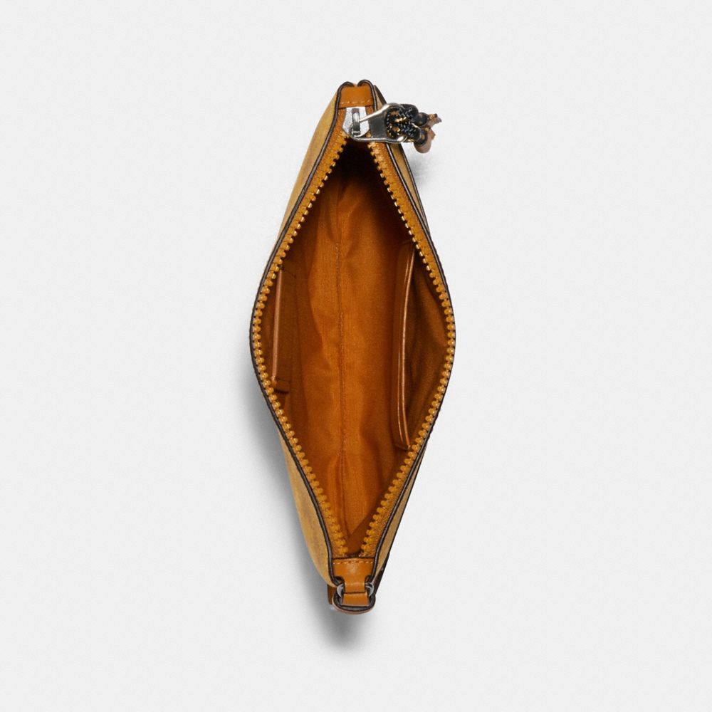 Printed coated canvas with smooth leather details| Two credit card slots| Zip-top closure, fabric lining| Outside zip pocket| Detachable wrist strap| 9 1/4" (L) x 6 3/4" (H)