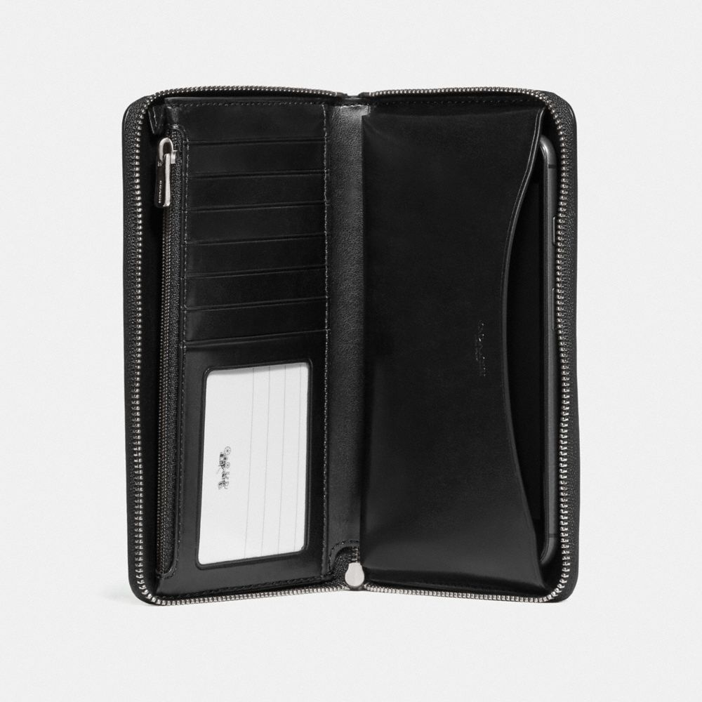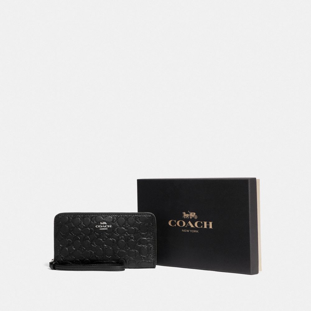 Signature smooth leather| Six credit card slots| ID window| Zip coin pocket| Inside phone pocket| Zip-around closure| Wrist strap attached| 7 1/4" (L) x 4" (H) x 3/4" (W)| Packaged in a Coach gift box