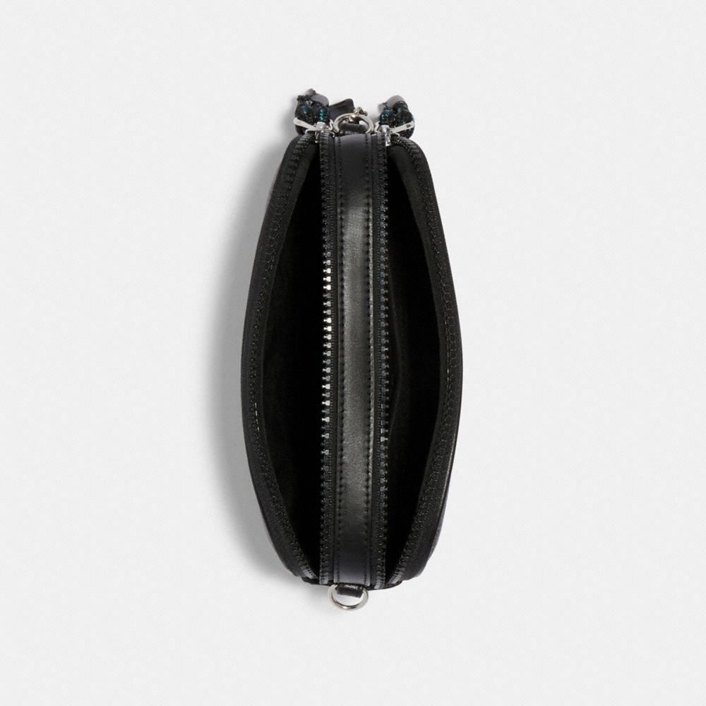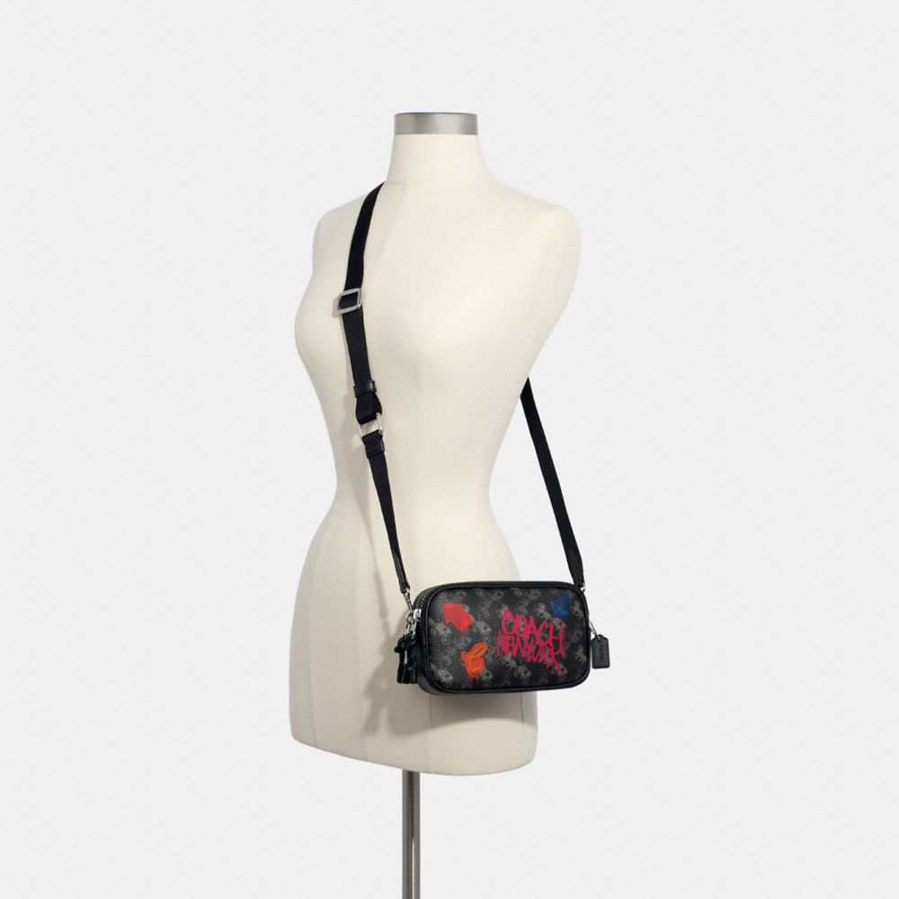Printed coated canvas with smooth leather details| Two credit card slots| Inside multifunction pocket| Double zip closure, fabric lining| Detachable strap with 23" drop for shoulder or crossbody wear| 7 1/2" (L) x 4 1/2" (H) x 1 1/2" (W) | Featuring the graphics of artist and graphic designer Jay Shells