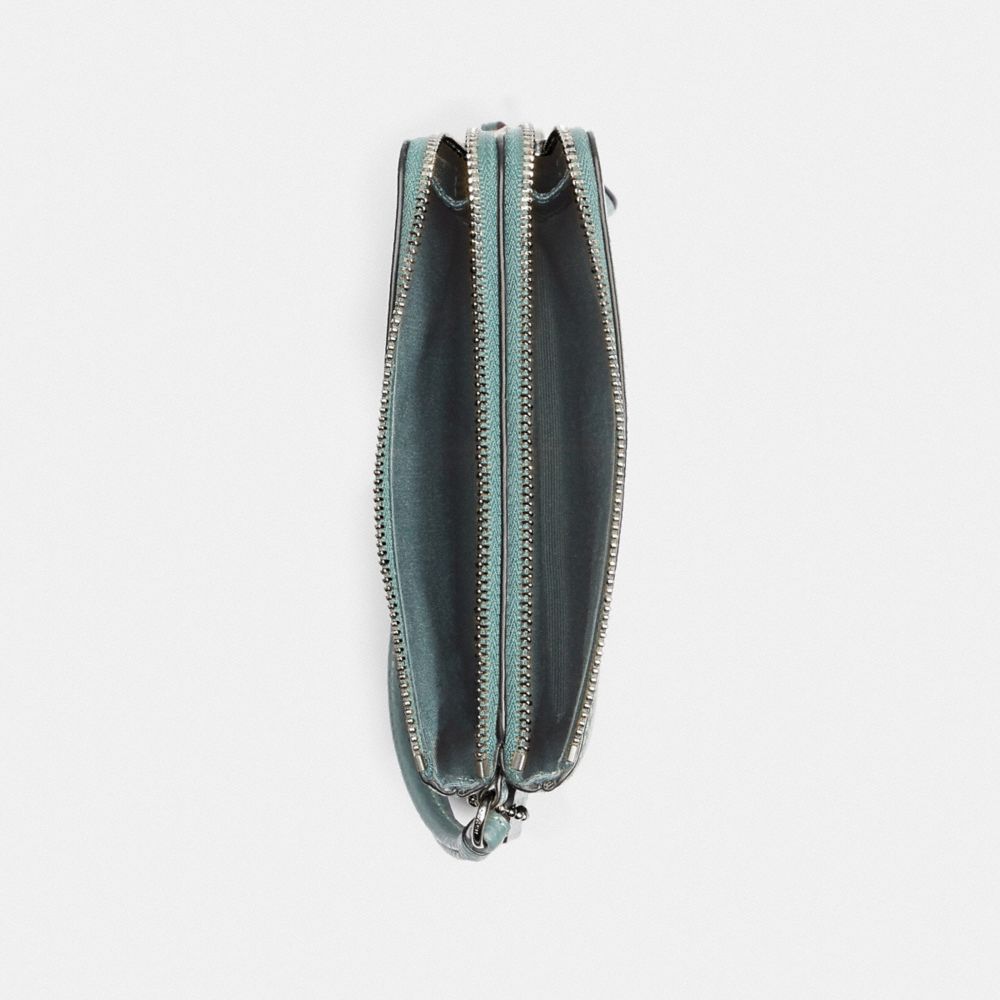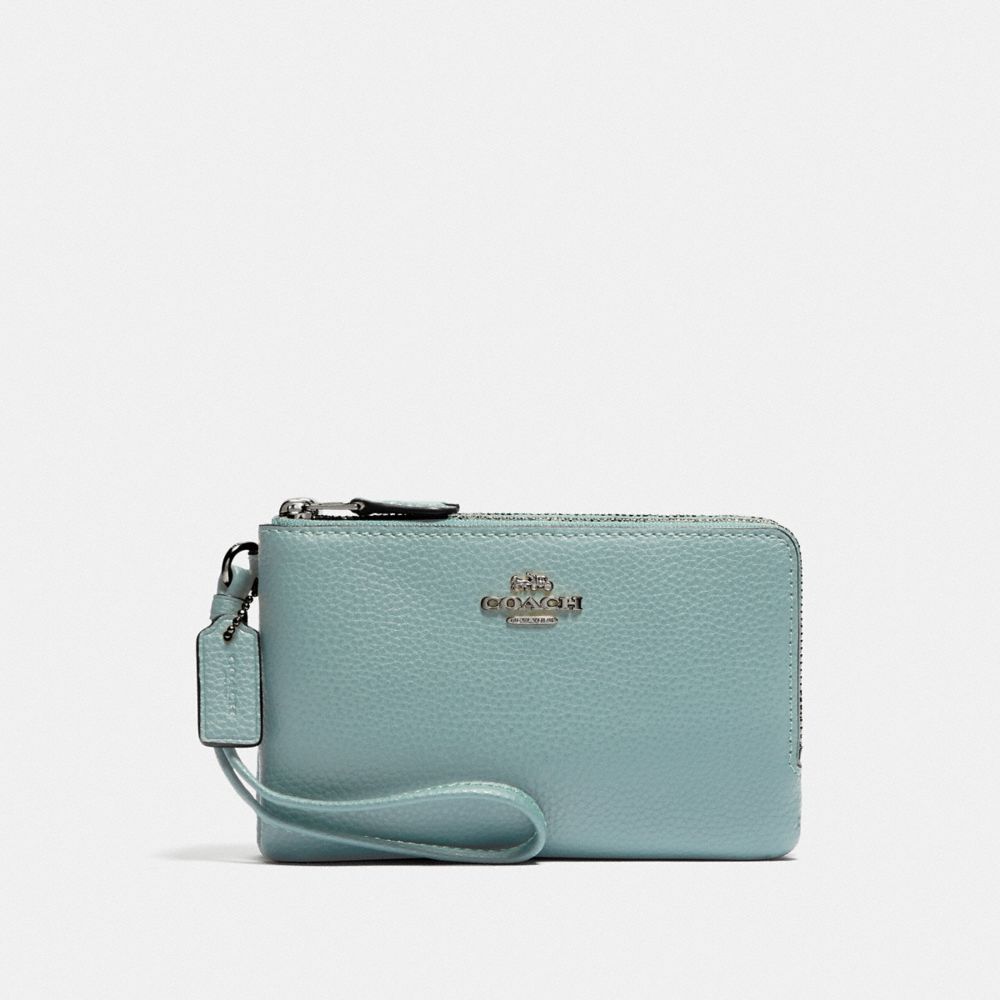 Polished pebble leather| Two credit card slots| Double zip closure, fabric lining| Wrist strap attached| 6 1/2" (L) x 3 3/4" (H) | Fits an iPhone or Android