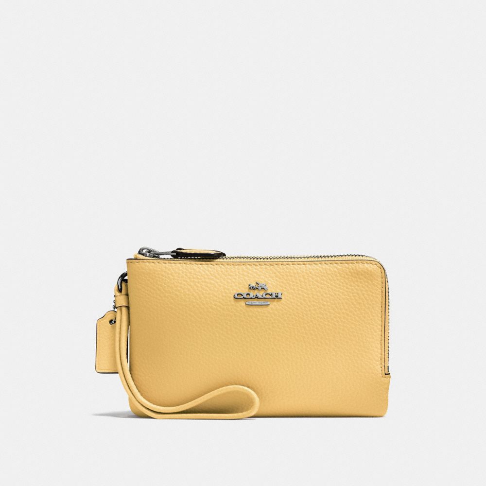 Polished pebble leather| Two credit card slots| Double zip closure, fabric lining| Wrist strap attached| 6 1/2" (L) x 3 3/4" (H) | Fits an iPhone or Android