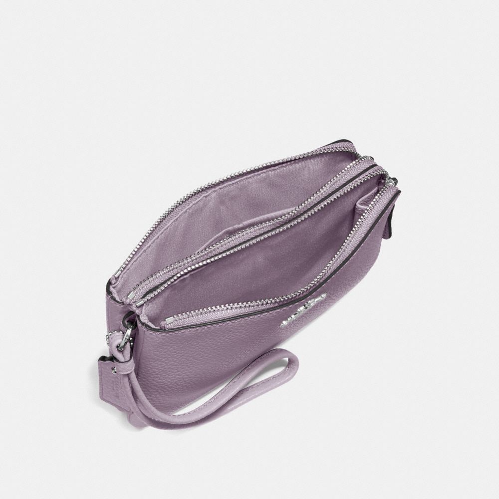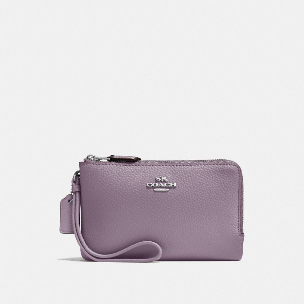 Polished pebble leather| Two credit card slots| Double zip closure, fabric lining| Wrist strap attached| 6 1/2" (L) x 3 3/4" (H) | Fits an iPhone or Android