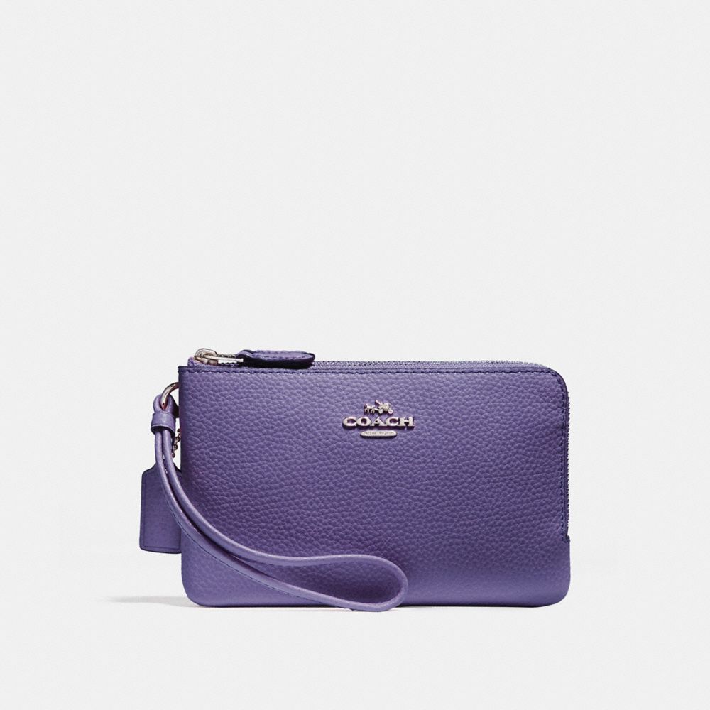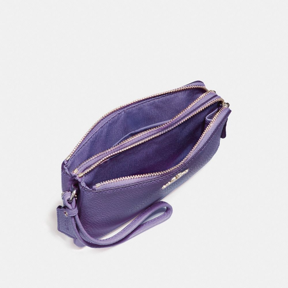 | Polished pebble leather| Two credit card slots| Double zip closure, fabric lining| Wrist strap attached| 6 1/2" (L) x 3 3/4" (H) | Fits an iPhone or Android