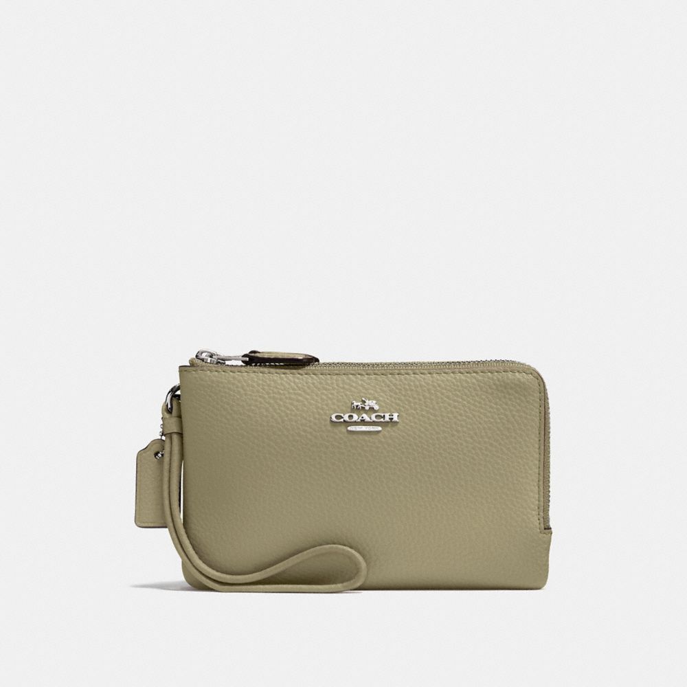 Polished pebble leather| Two credit card slots| Double zip closure, fabric lining| Wrist strap attached| 6 1/2" (L) x 3 3/4" (H) | Fits an iPhone or Android