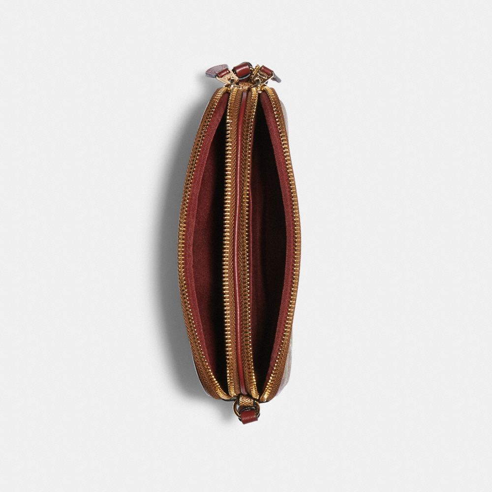 Signature coated canvas with smooth leather details| Two credit card slots| Inside multifunction pocket| Double zip closure, fabric lining| Adjustable strap with 23" drop for shoulder or crossbody wear| 7 1/2" (L) x 4 1/2" (H) x 1 1/2" (W)