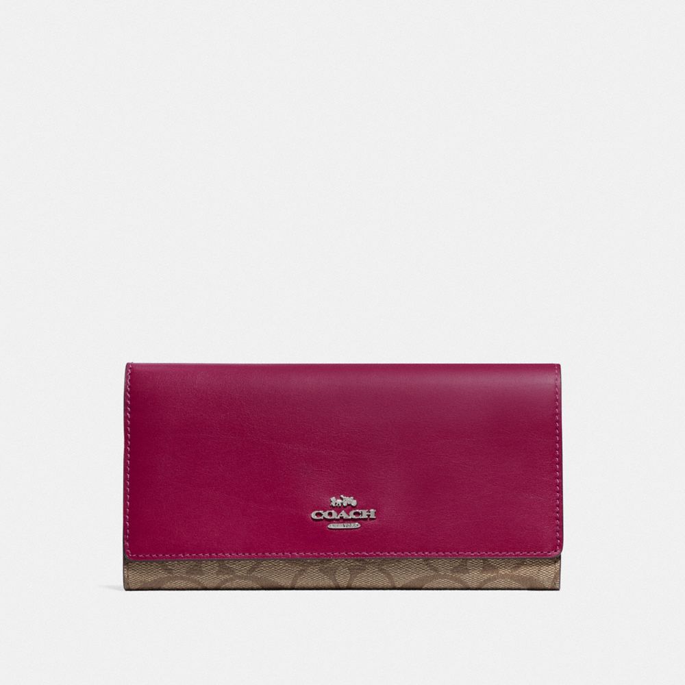 Signature coated canvas and smooth leather| Ten credit card slots| Full-length bill compartment| Zip coin pocket| Snap closure| ID window| 7 3/4" (L) x 4 1/4" (H)