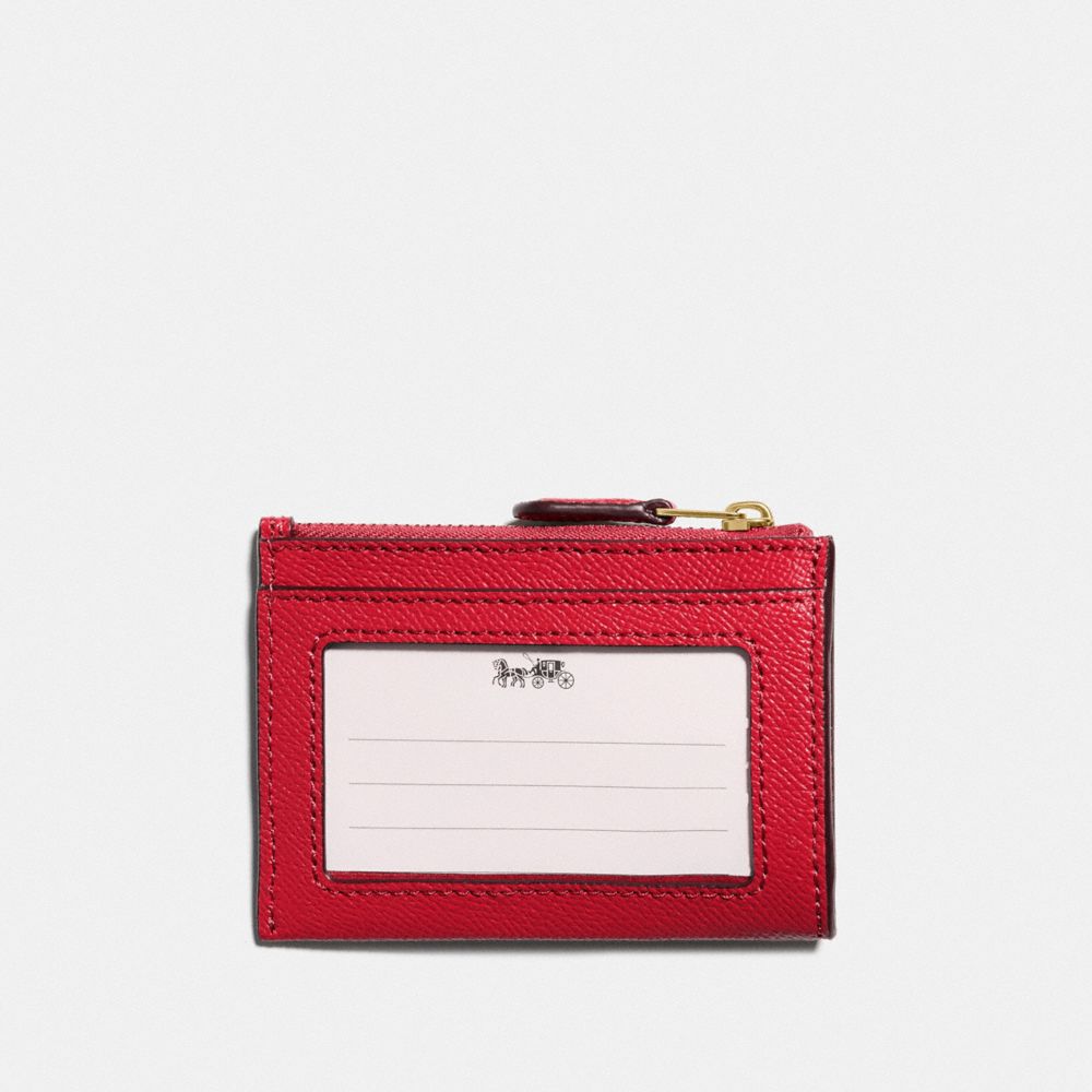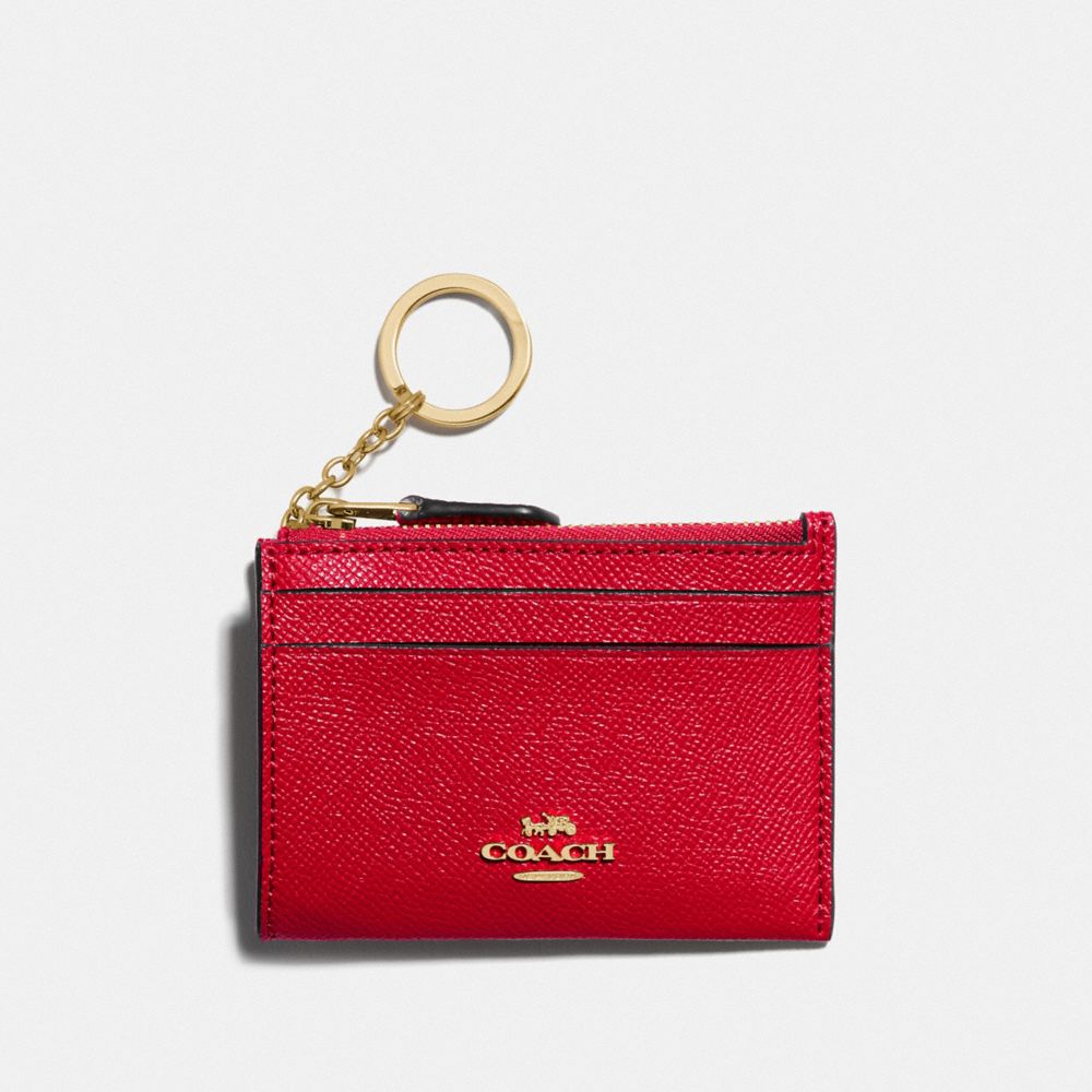 Crossgrain leather| Two credit card slots| ID window| Zip-top closure, fabric lining| Attached split key ring| 4 1/4" (L) x 3" (H) x 1/2" (W)
