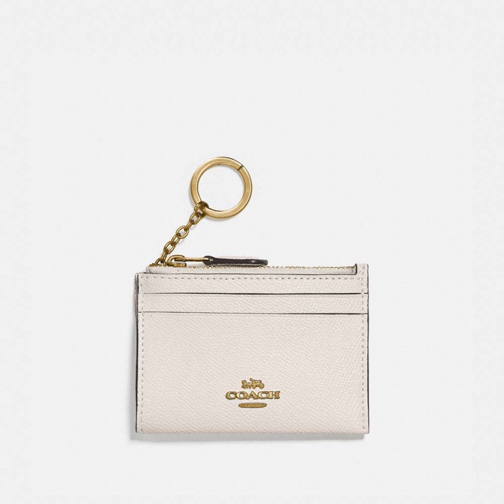 Crossgrain leather| Two credit card slots| ID window| Zip-top closure, fabric lining| Attached split key ring| 4 1/4" (L) x 3" (H) x 1/2" (W)