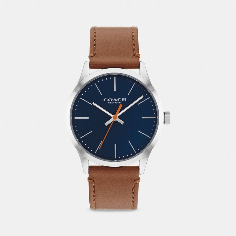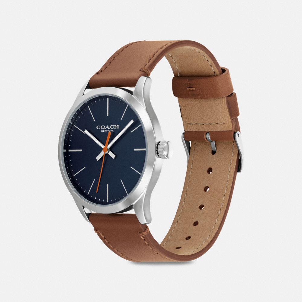 Stainless steel case and leather strap| Approx. case diameter: 39mm| Mineral crystal| Quartz movement| Buckle closure| Water-resistant to 99 feet