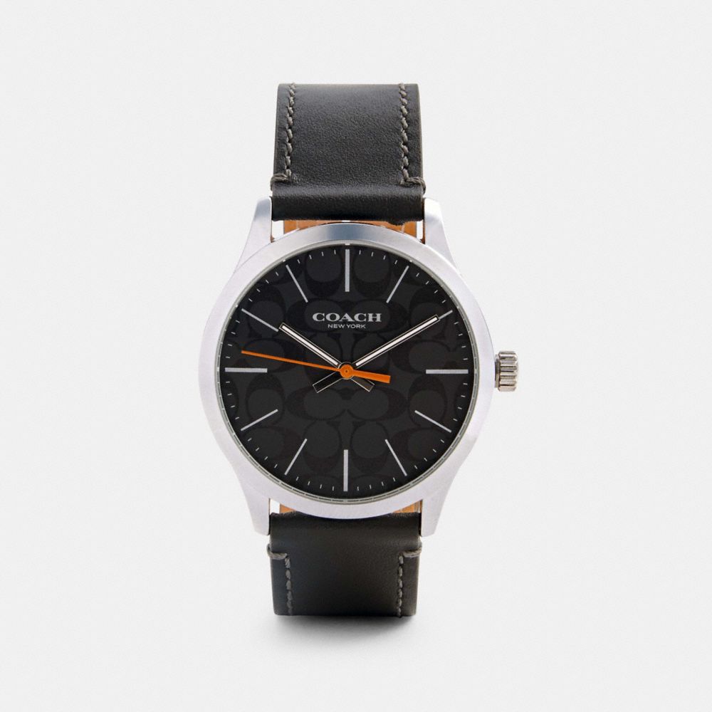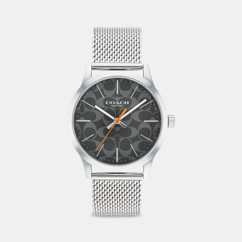 Stainless steel case and mesh strap| Interchangeable leather strap included| Approx. case diameter: 39mm| Mineral crystal| Quartz movement| Deployment closure | Water-resistant to 99 feet| Packaged in a Coach gift box