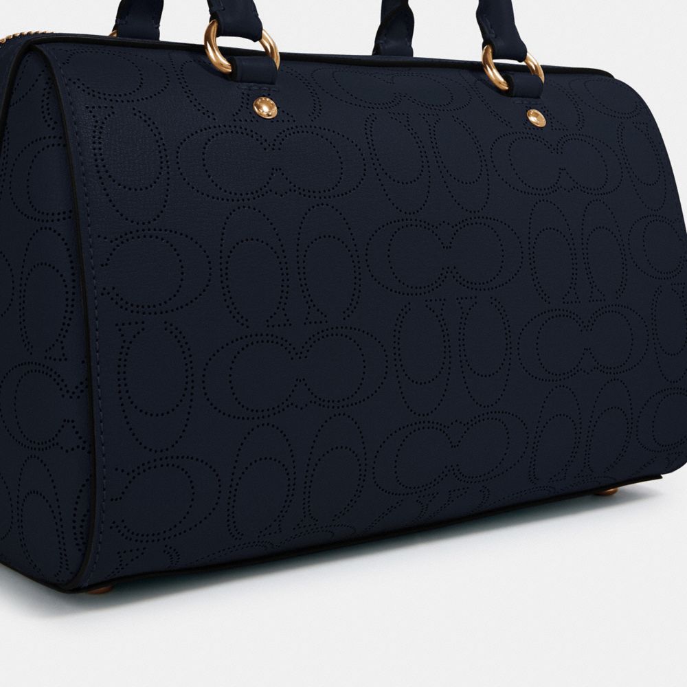 Signature perforated leather and smooth leather| Inside zip and multifunction pockets| Zip closure, fabric lining| Handles with 4 1/4" drop| Outside zip pocket| Detachable strap with 23" drop for shoulder or crossbody wear| 10 1/2" (L) x 6 1/4" (H) x 5 1/2" (W)