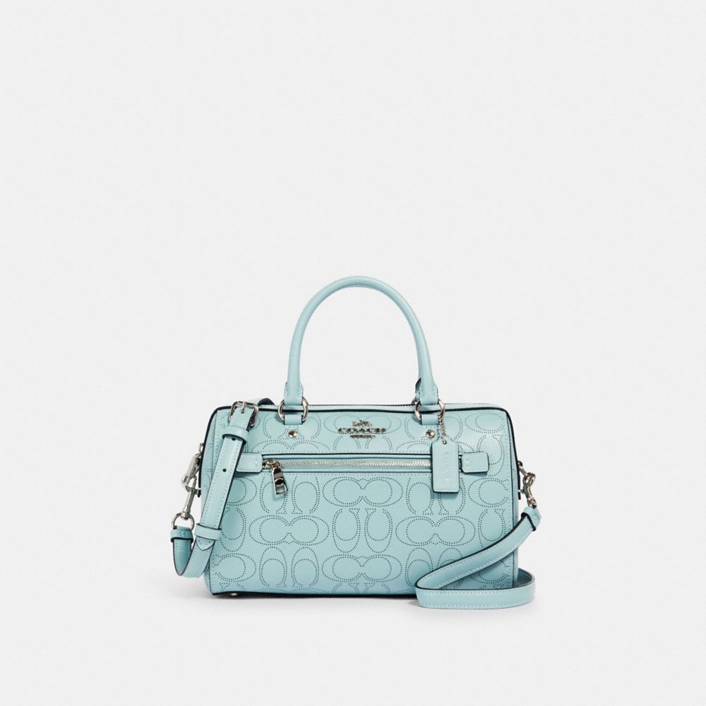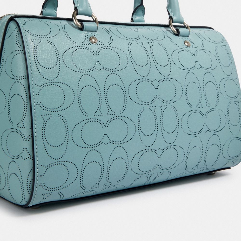 Signature perforated leather and smooth leather| Inside zip and multifunction pockets| Zip closure, fabric lining| Handles with 4 1/4" drop| Outside zip pocket| Detachable strap with 23" drop for shoulder or crossbody wear| 10 1/2" (L) x 6 1/4" (H) x 5 1/2" (W)