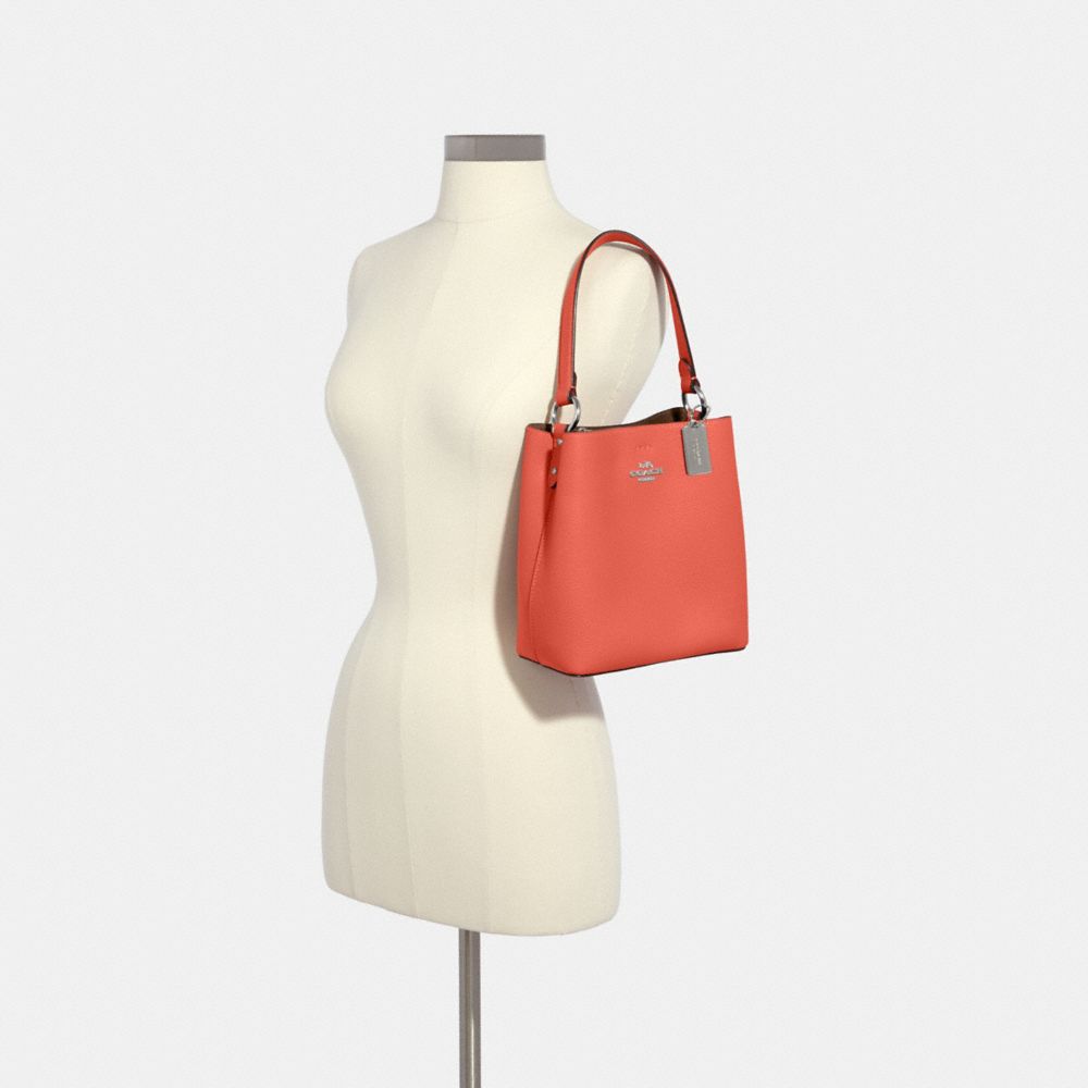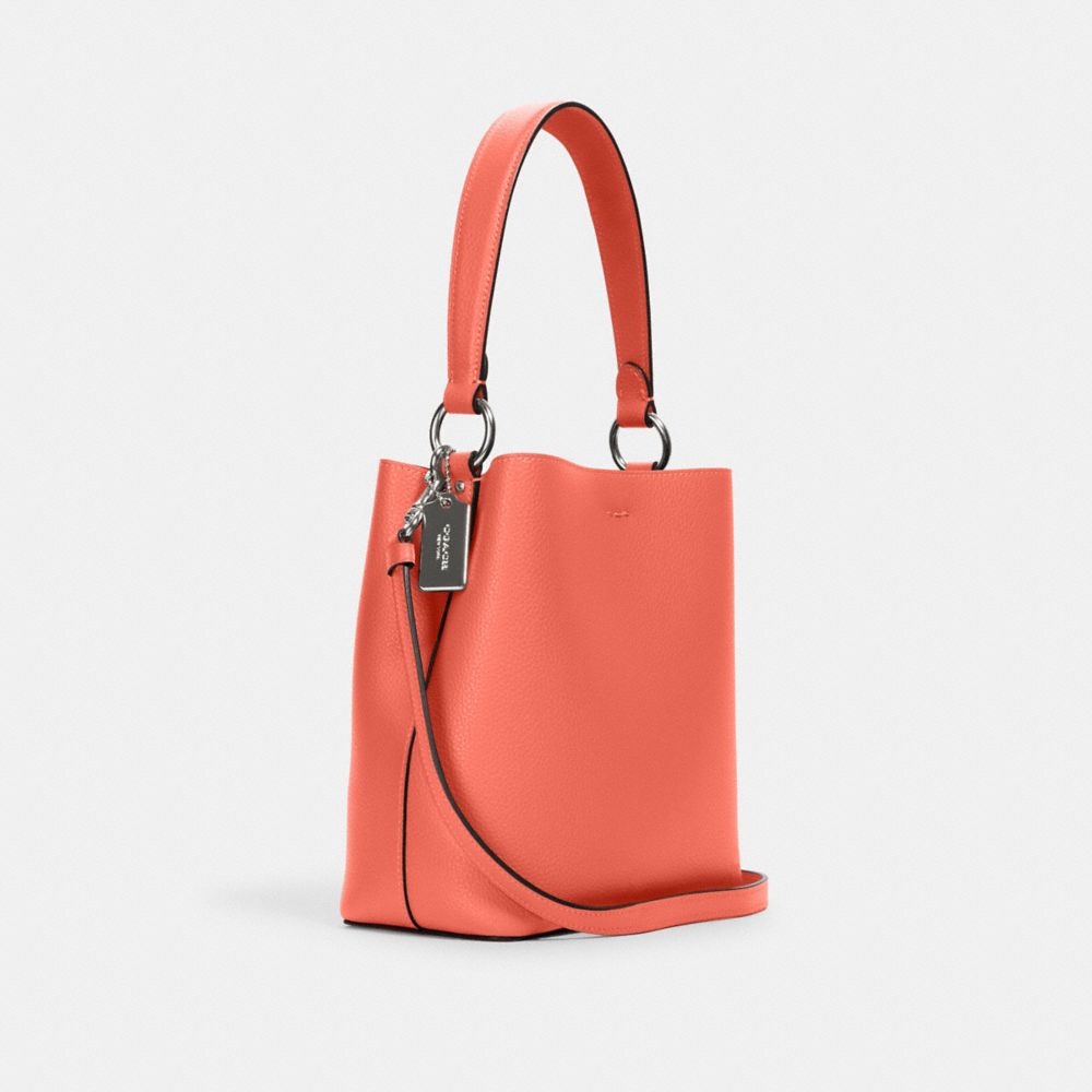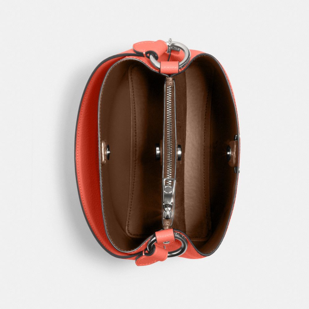 Polished pebble leather| Center zip compartment| Snap closure| Handle with 6 3/4" drop| Detachable strap with 22" drop for shoulder or crossbody wear| 8 1/2" (L) x 8 1/2" (H) x 4" (W)