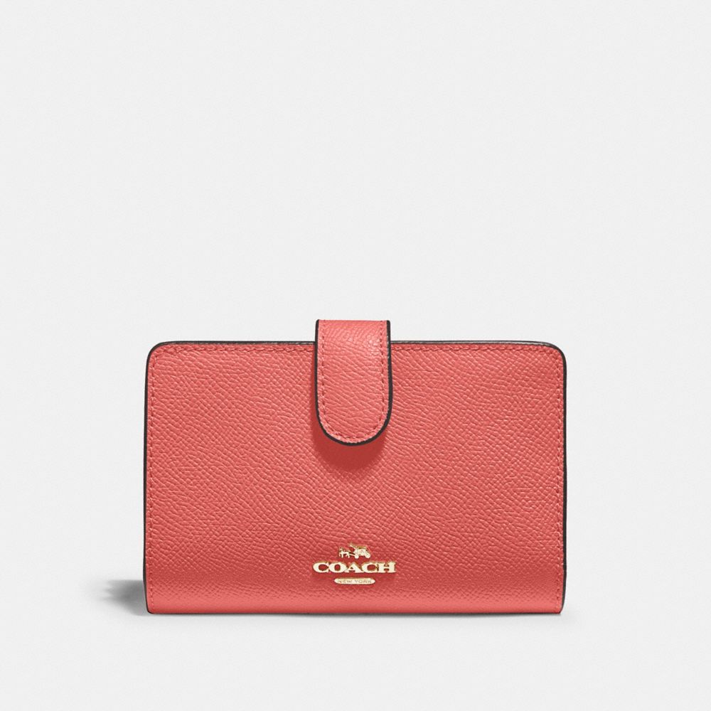 Crossgrain leather| Seven credit card slots| Bill compartment| ID window| Zip pocket| Snap closure| 5" (L) x 3 1/2" (H) x 1/2" (W)