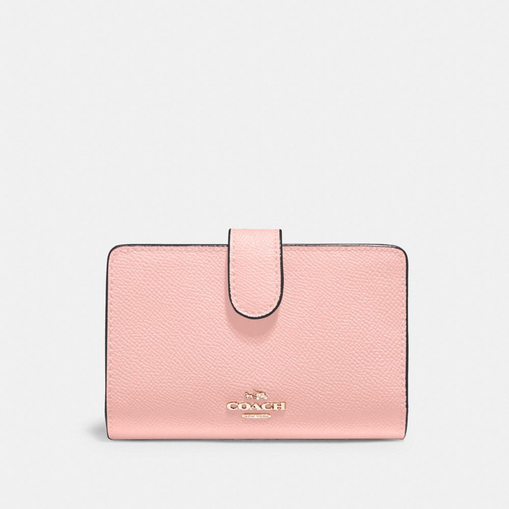 Crossgrain leather| Seven credit card slots| Bill compartment| ID window| Zip pocket| Snap closure| 5" (L) x 3 1/2" (H) x 1/2" (W)