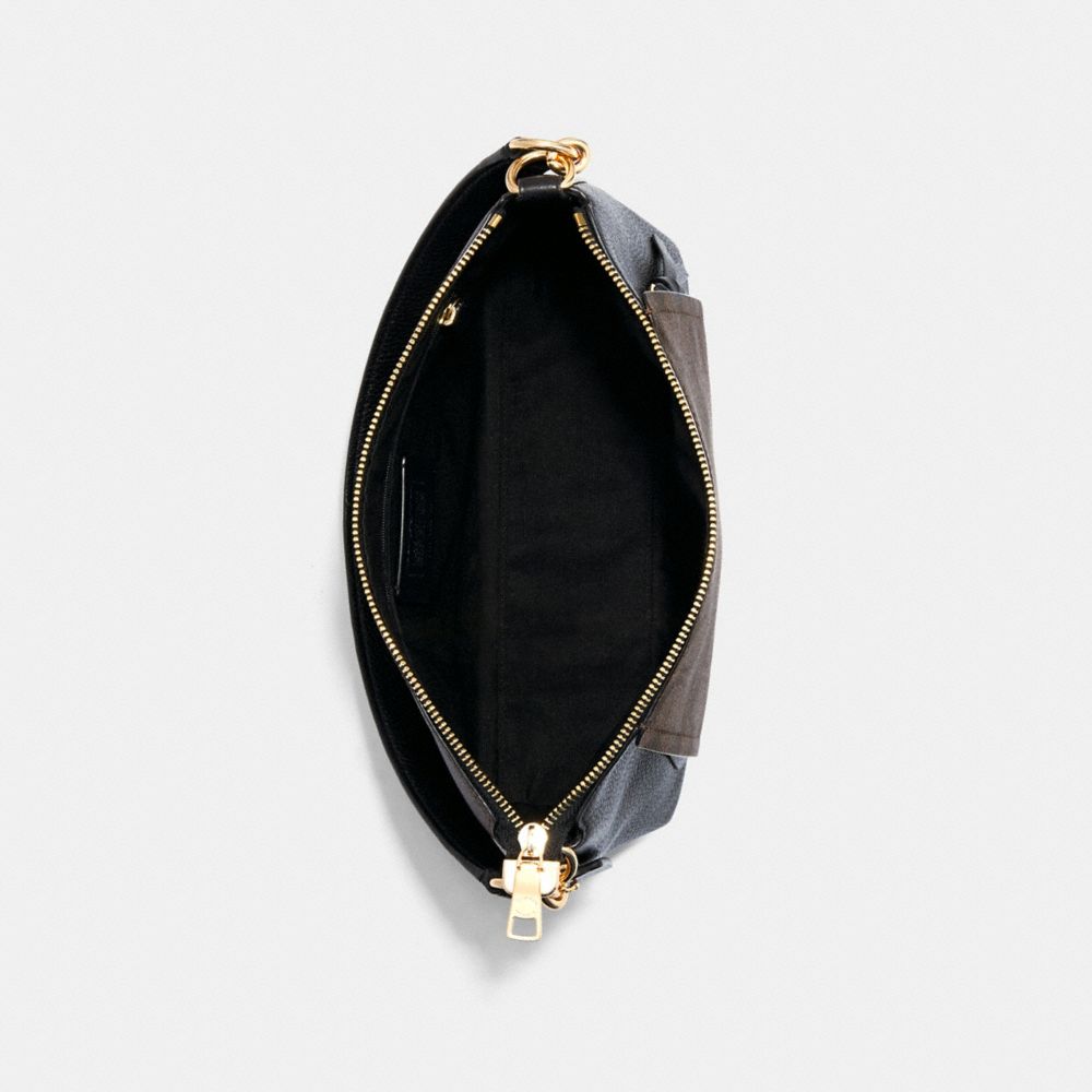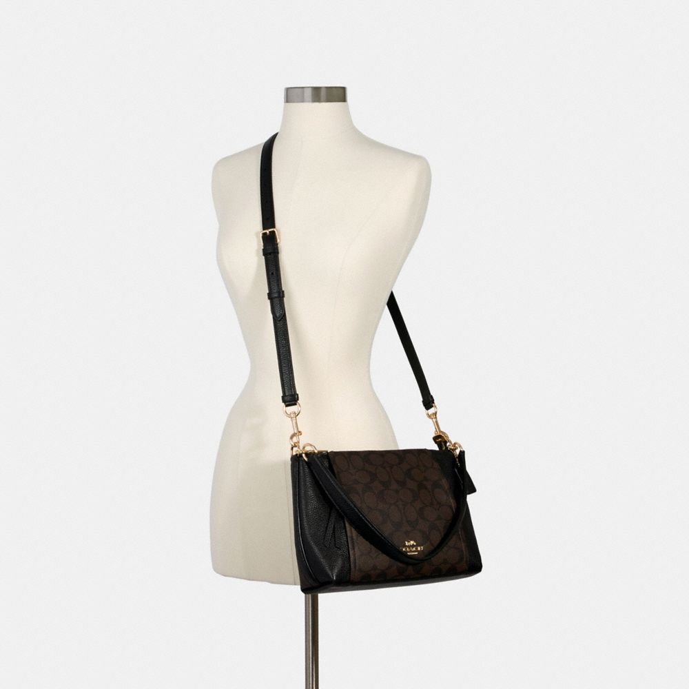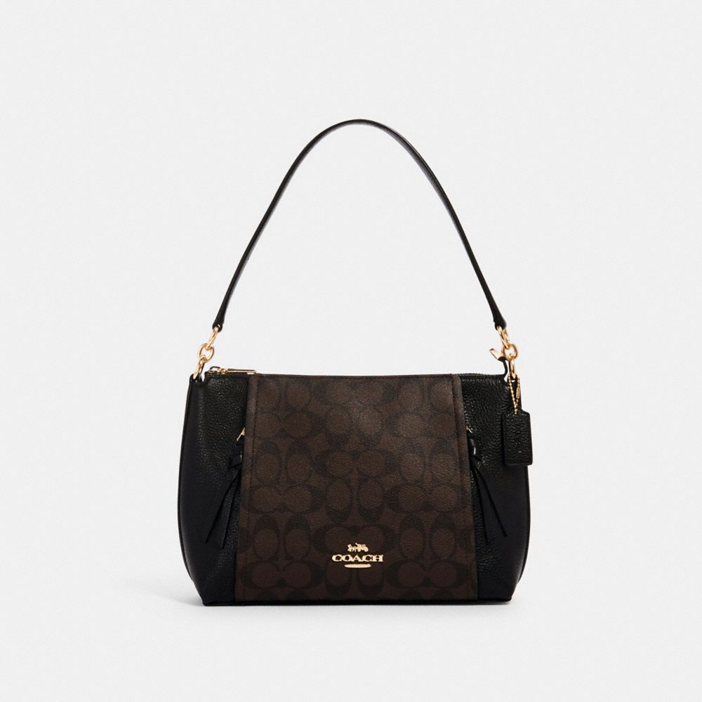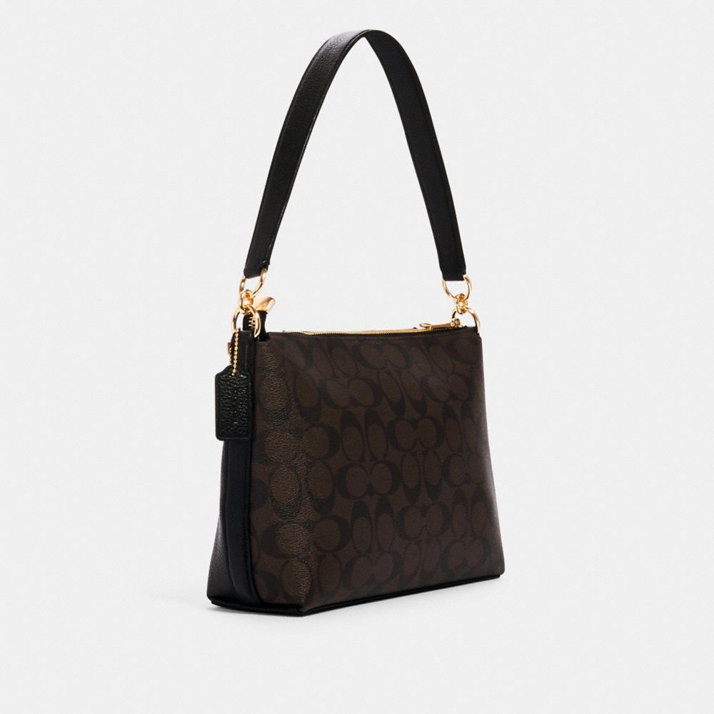 Signature coated canvas and refined pebble leather| Inside zip pocket| Zip-top closure, fabric lining| Handle with 8 1/2" drop| Outside zip pockets| Detachable strap with 20 3/4" drop for shoulder or crossbody wear| 10 3/4" (L) x 7 1/2" (H) x 3 3/4" (W)