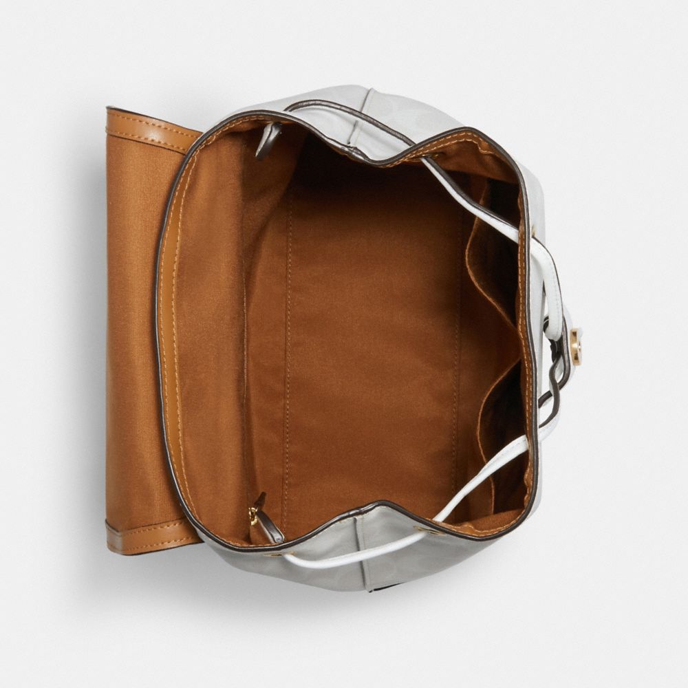 Signature coated canvas and smooth leather| Inside zip and multifunction pockets| Drawstring and snap closures, fabric lining| Top handle with 3 1/4" drop| Adjustable shoulder straps| 9 3/4" (L) x 10 3/4" (H) x 3 1/4" (W)