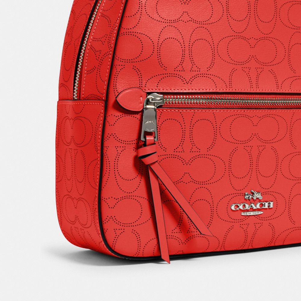 Signature perforated leather and smooth leather| Inside zip pocket| Zip closure, fabric lining| Top handle with 2" drop| Outside zip pocket| Adjustable shoulder straps| 10 1/2" (L) x 12 1/4" (H) x 3 3/4" (W)