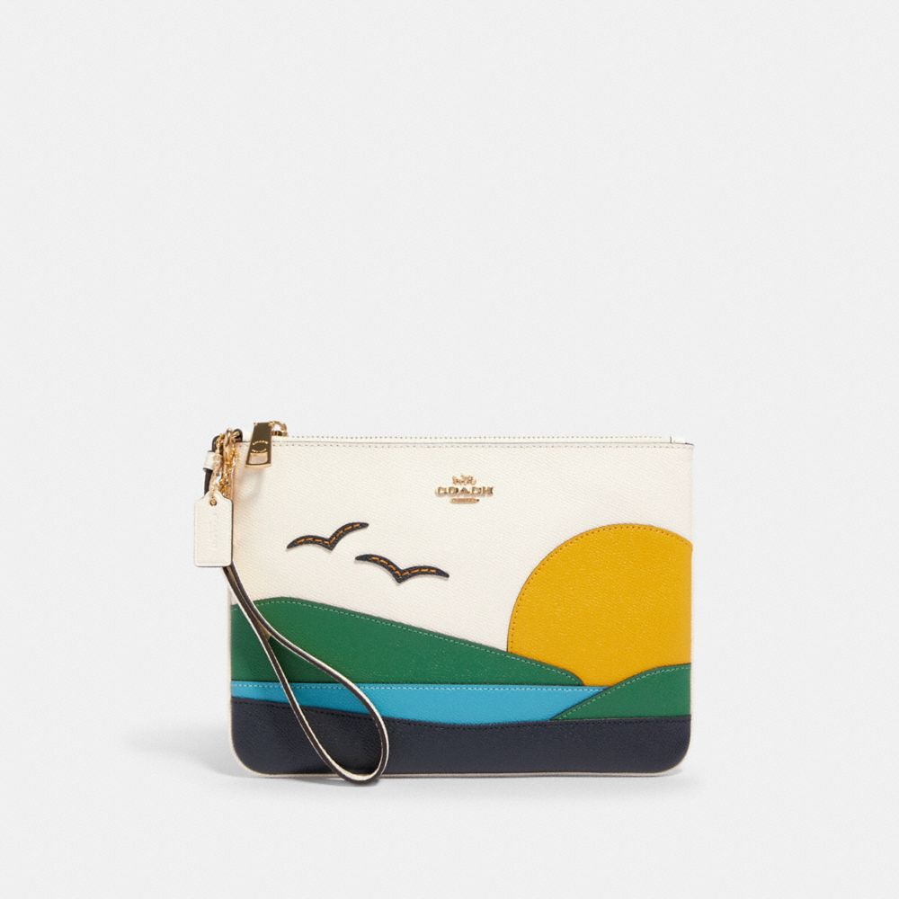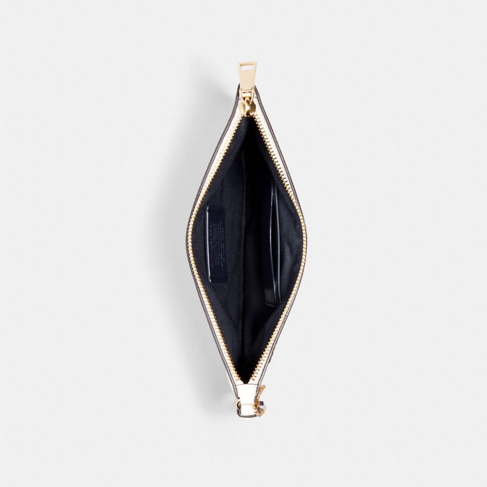 Crossgrain leather| Two credit card slots| Zip-top closure, fabric lining| Outside zip pocket| Detachable wrist strap| 9 1/4" (L) x 6 3/4" (H)
