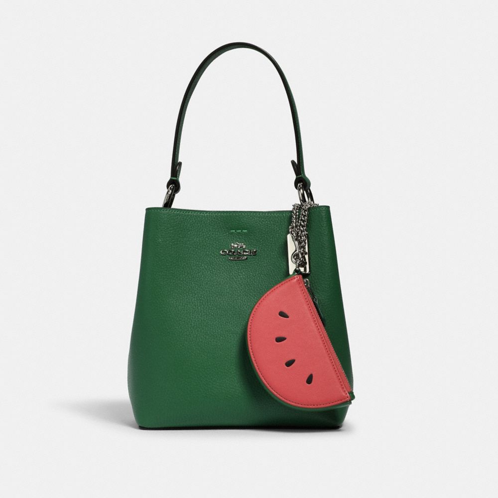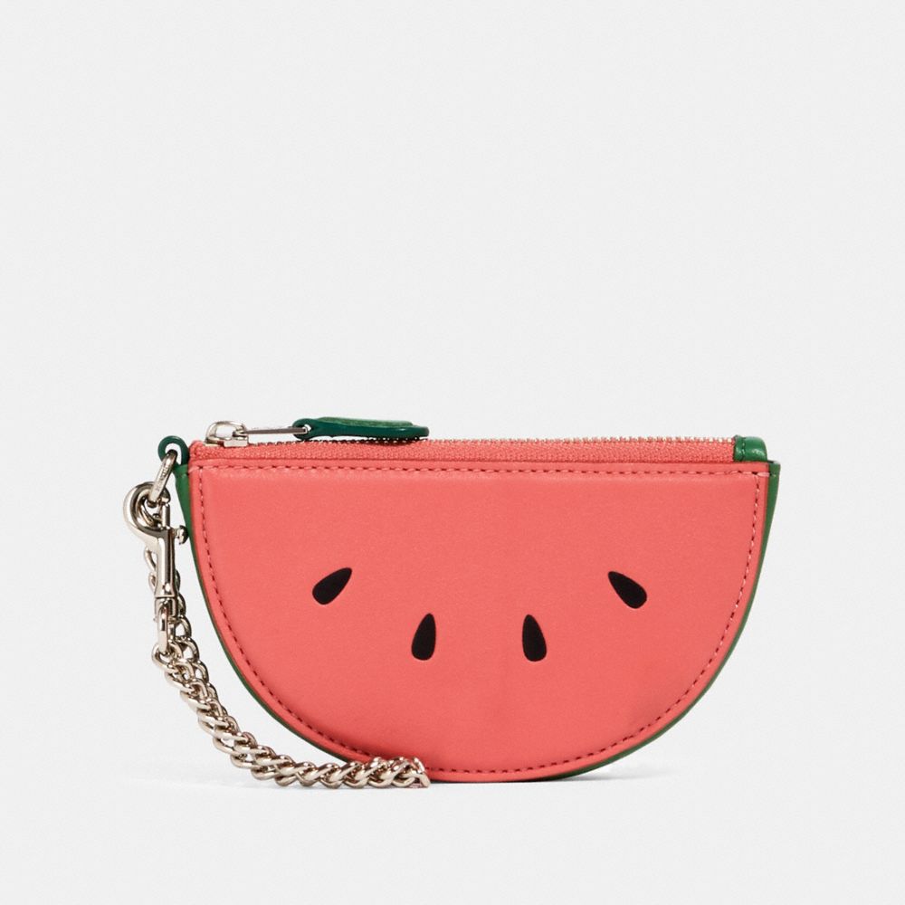 Smooth leather| Zip closure, fabric lining| Attached chain strap with dogleash clip| 5" (L) x 2 3/4" (H) x 3/4" (W)