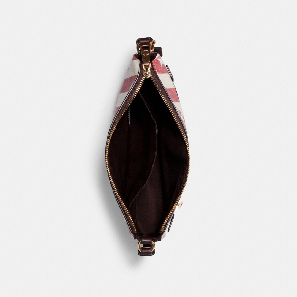 Printed coated canvas with smooth leather details| Inside multifunction pocket| Zip-top closure, fabric lining| Outside zip pocket| Adjustable strap with 21 1/4" drop for shoulder or crossbody wear| 10" (L) x 7 1/4" (H) x 2" (W)