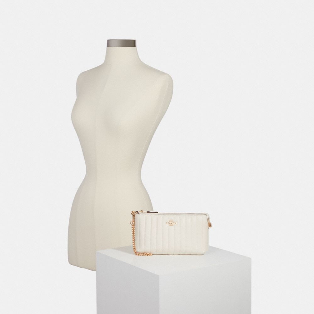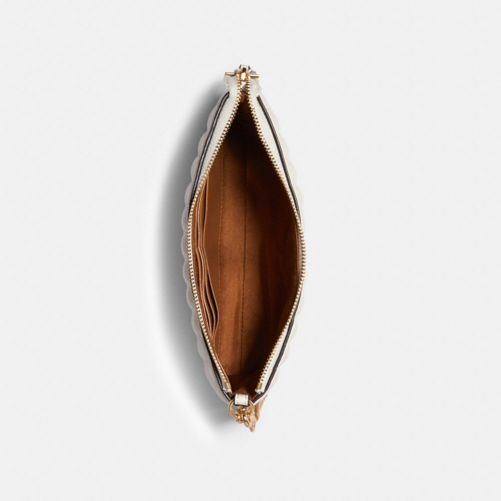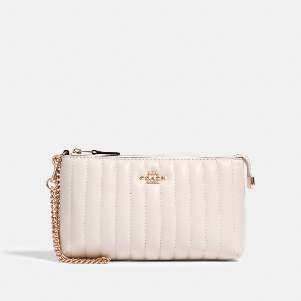 Nappa leather and smooth leather| Eight credit card slots| Zip-top closure, fabric lining| Chain wrist strap with dogleash clip attached| 8" (L) x 4 3/4" (H) x 3/4" (W)