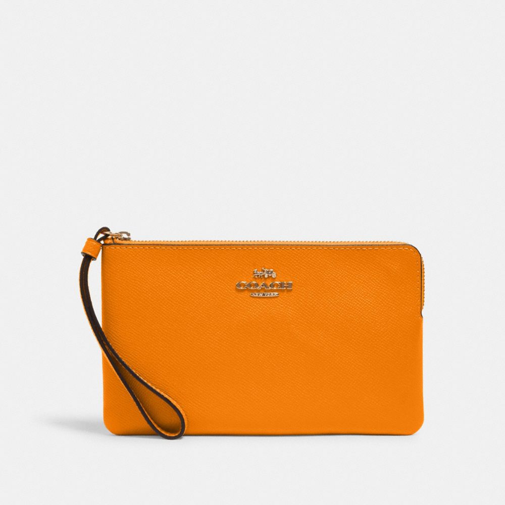 Crossgrain leather| Two credit card slots| Zip closure, fabric lining| Wrist strap attached| 7 3/4" (L) x 4 3/4" (H) x 1/2" (W)