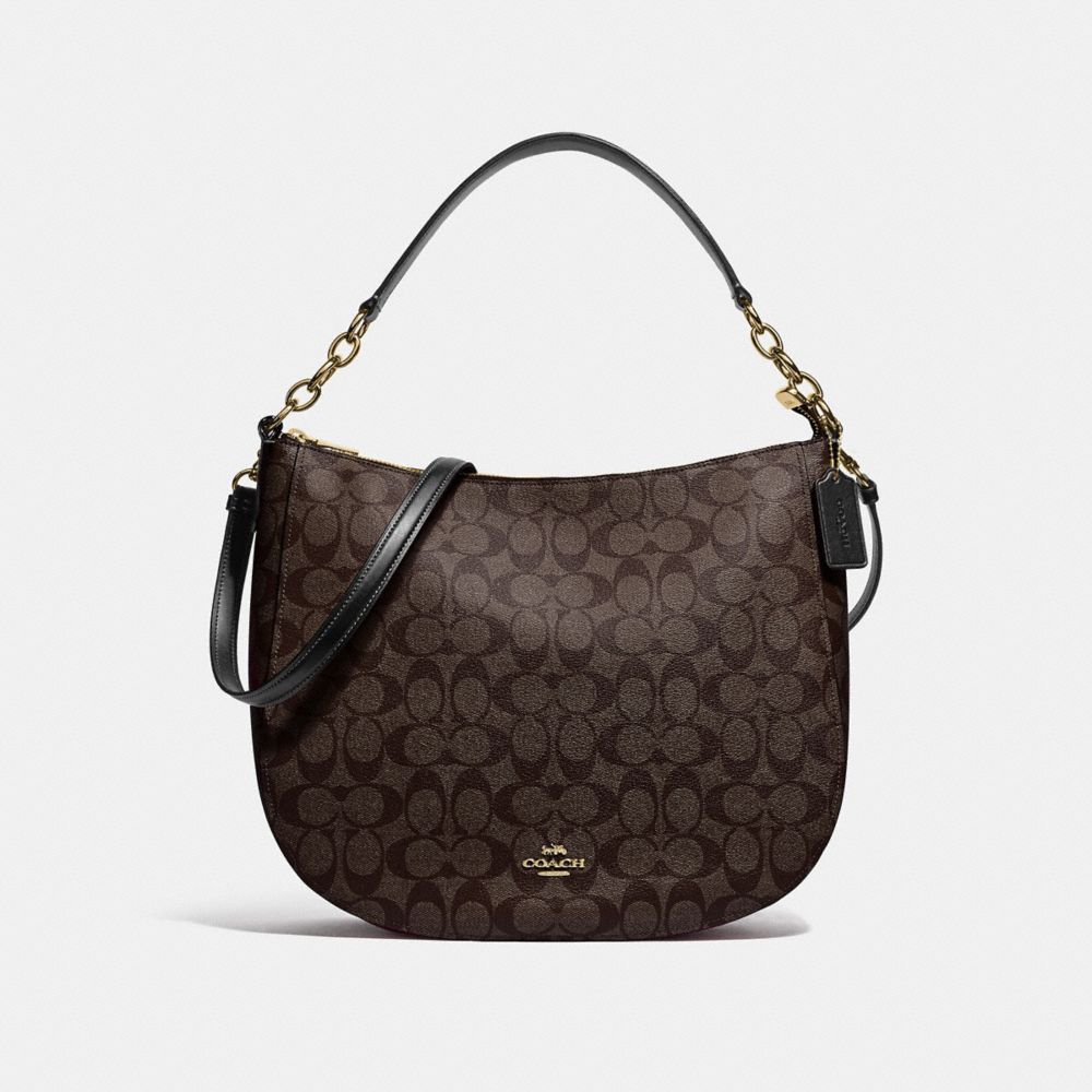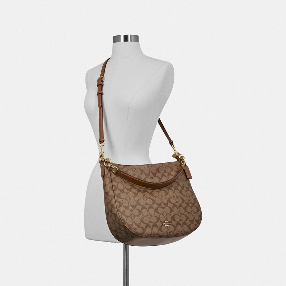 Signature coated canvas with smooth leather details| Inside cell phone and multifunction pockets| Zip-top closure, fabric lining| Handle with 8 3/4" drop| Outside zip pocket| Detachable strap with 15 1/4" drop for shoulder wear| 13" (L) x 10 3/4" (H) x 4" (W)