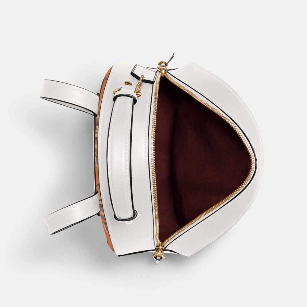 Printed coated canvas and smooth leather| Inside zip pocket| Zip closure, fabric lining| Top handle with 2" drop| Outside zip pocket| Adjustable shoulder straps| 10 1/2" (L) x 12 1/4" (H) x 3 3/4" (W)