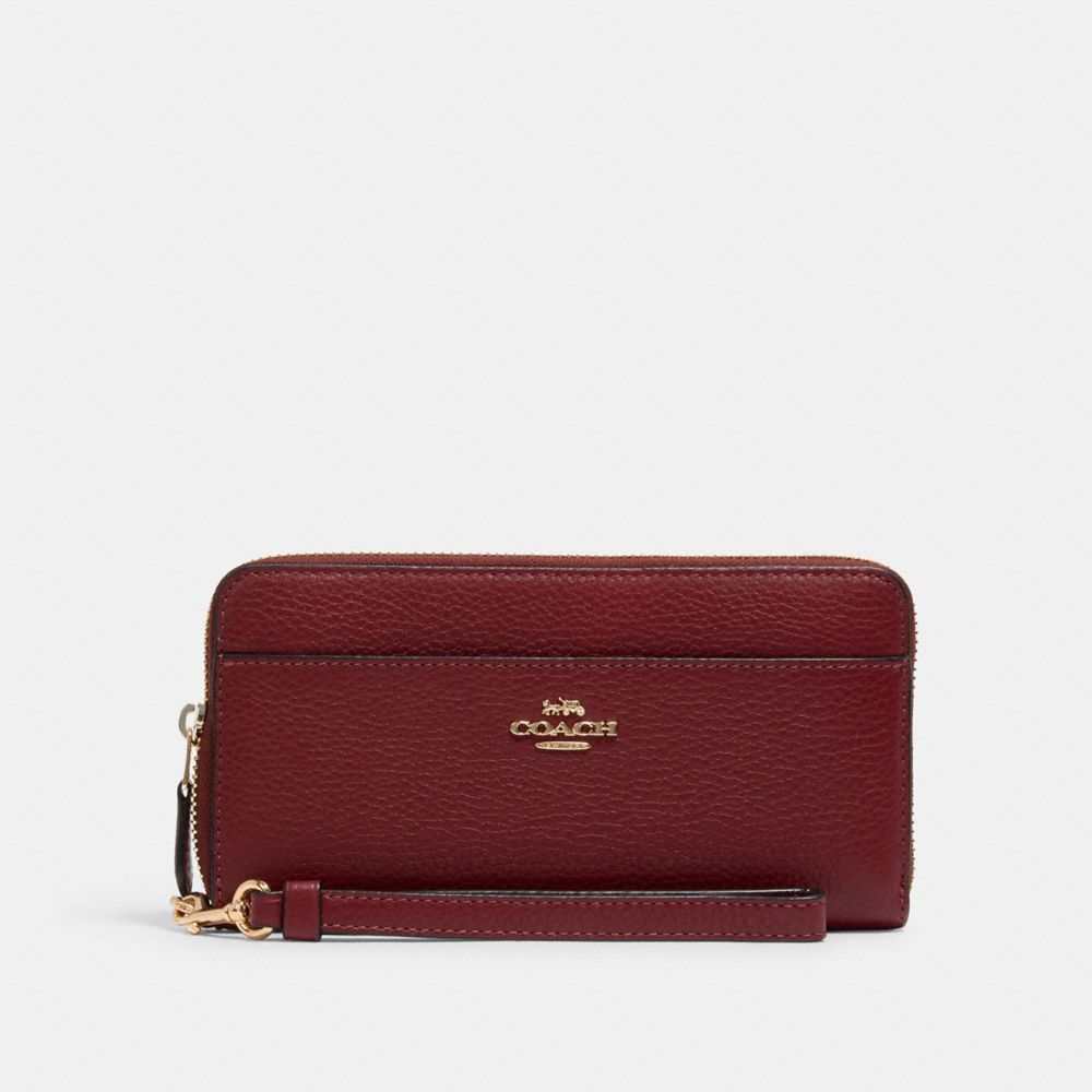 Refined pebble leather| 12 credit card slots| Full-length bill compartments| Zip coin pocket| Zip-around closure| Outside open pocket| Detachable wrist strap| 7 1/2" (L) x 4" (H) x 3/4" (W)| Fits all phone sizes up to an iPhone X and Samsung S7 Edge