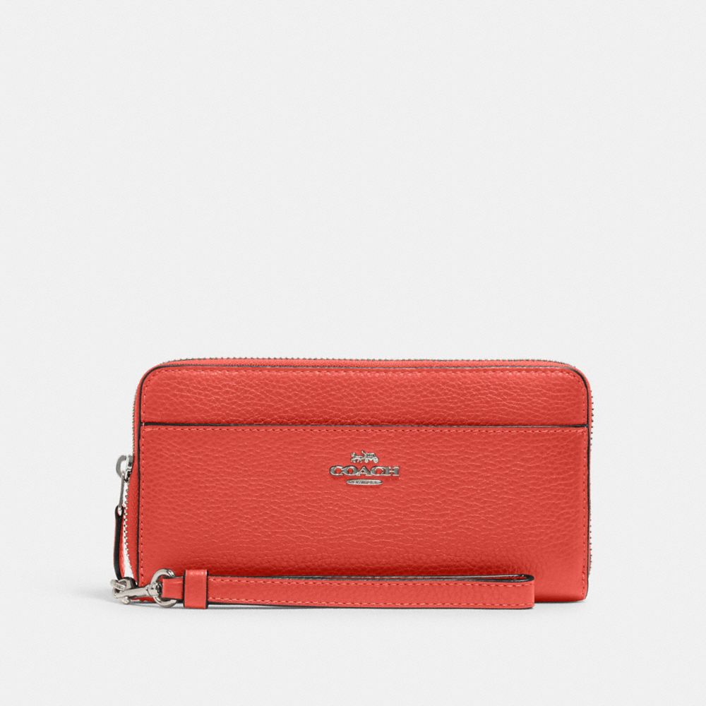Refined pebble leather| 12 credit card slots| Full-length bill compartments| Zip coin pocket| Zip-around closure| Outside open pocket| Detachable wrist strap| 7 1/2" (L) x 4" (H) x 3/4" (W)